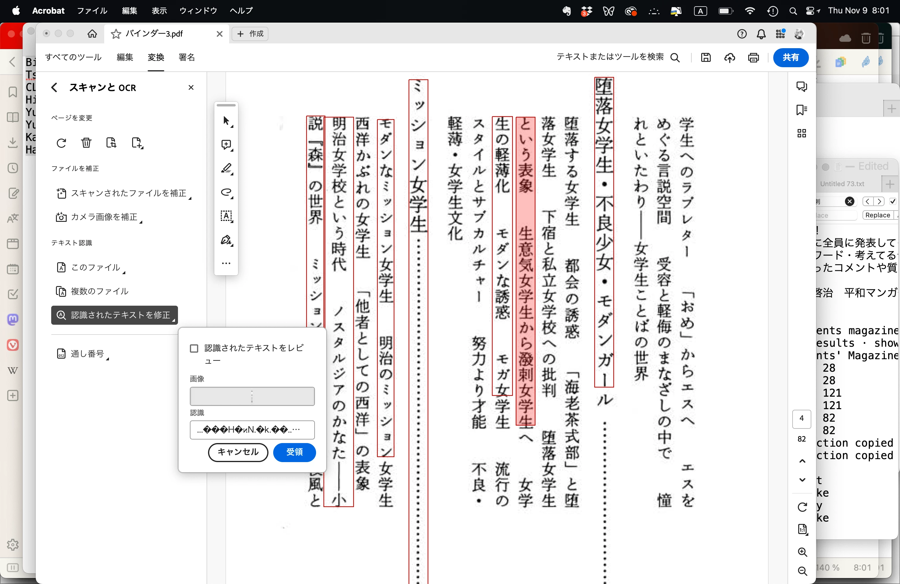「認識されたテキストを修正」は日本語の場合文字化けする