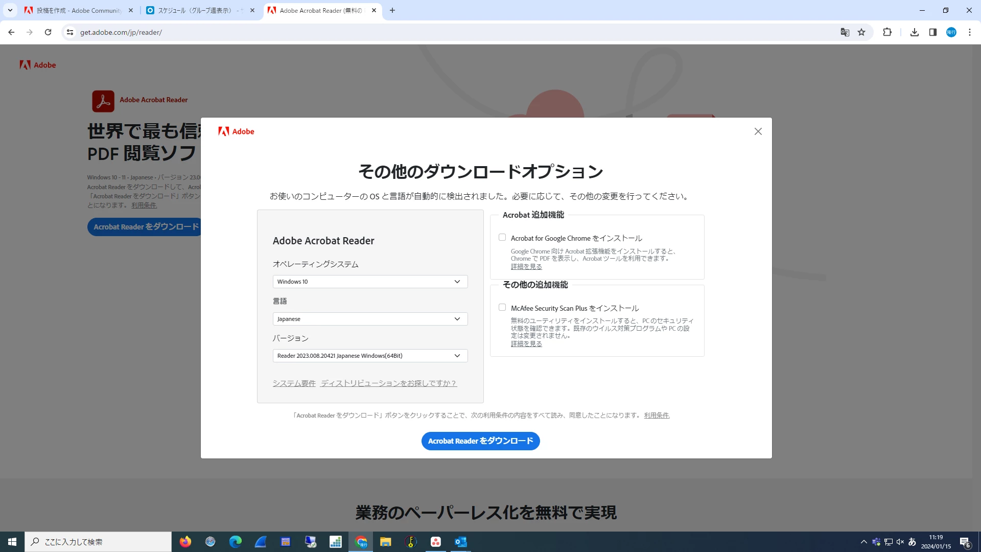 Acrobat Reader 64bitをダウンロード/インストールするも、32bit版になってしまう
