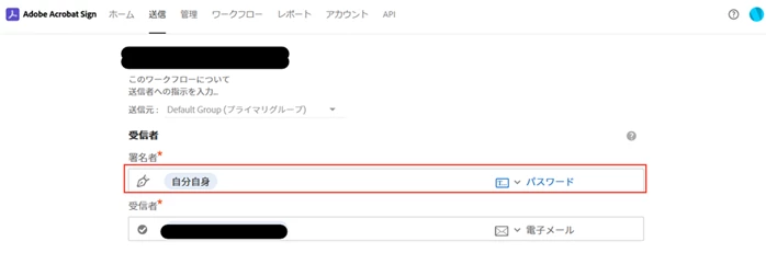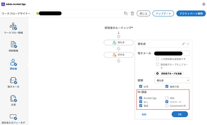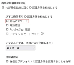 ・ワークフロー設定状況:署名者の ID 認証で「パスワード」が「オン」