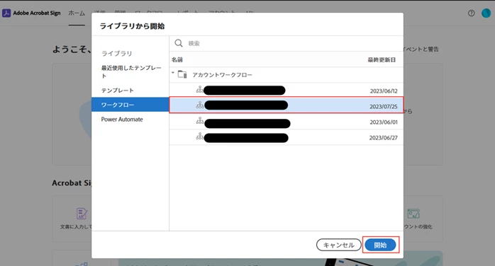 2. 該当のワークフローを選択し「開始」をクリックする。