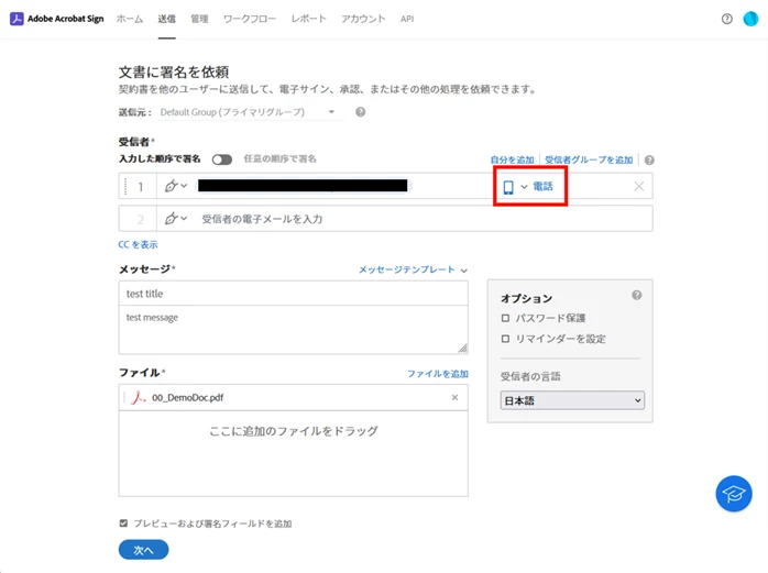 2. 署名者(または承認者)の認証方法「電話」または「パスワード」を選択し、署名を送信します。