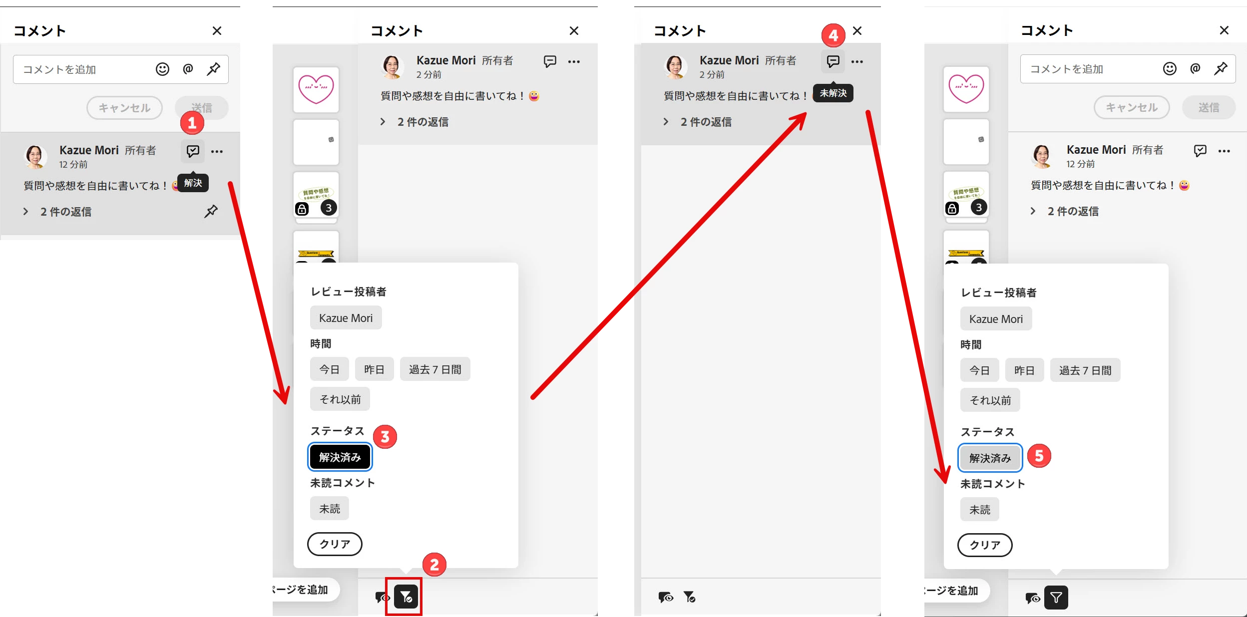 この時、解決済みのコメントの「未解決」❹アイコンをクリックすると、そのコメントを未解決に戻すことができます。