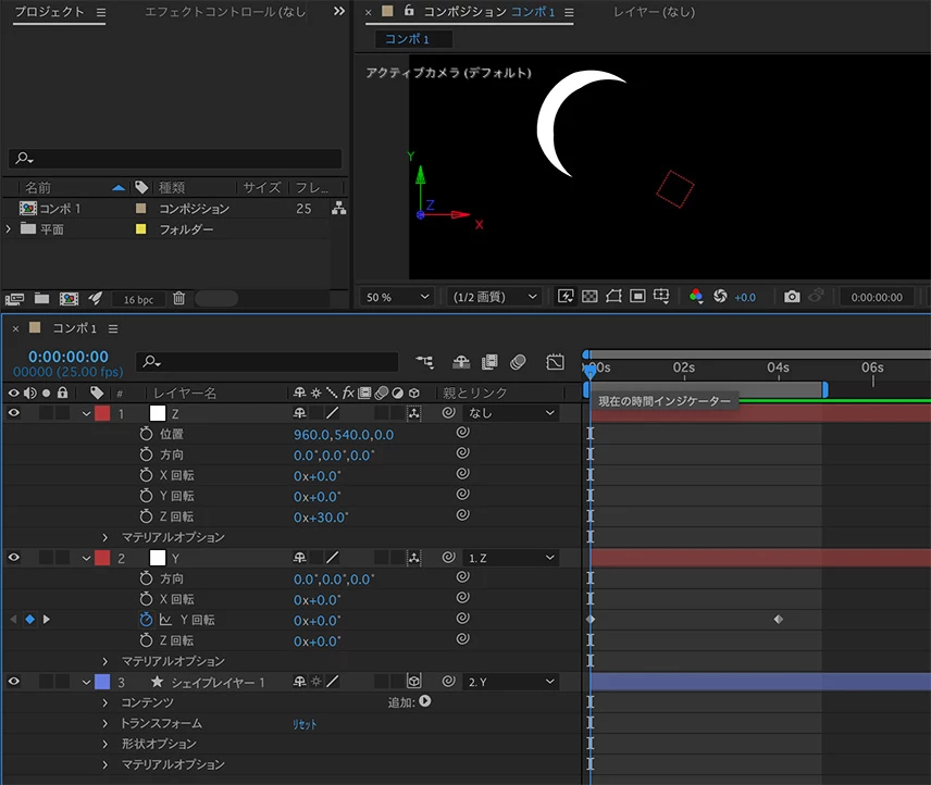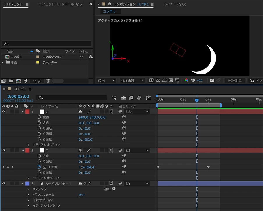 レイヤー1で位置とZ回転を設定して、レイヤー2でY回転にキーフレームを追加すれば希望の動きになると思います。