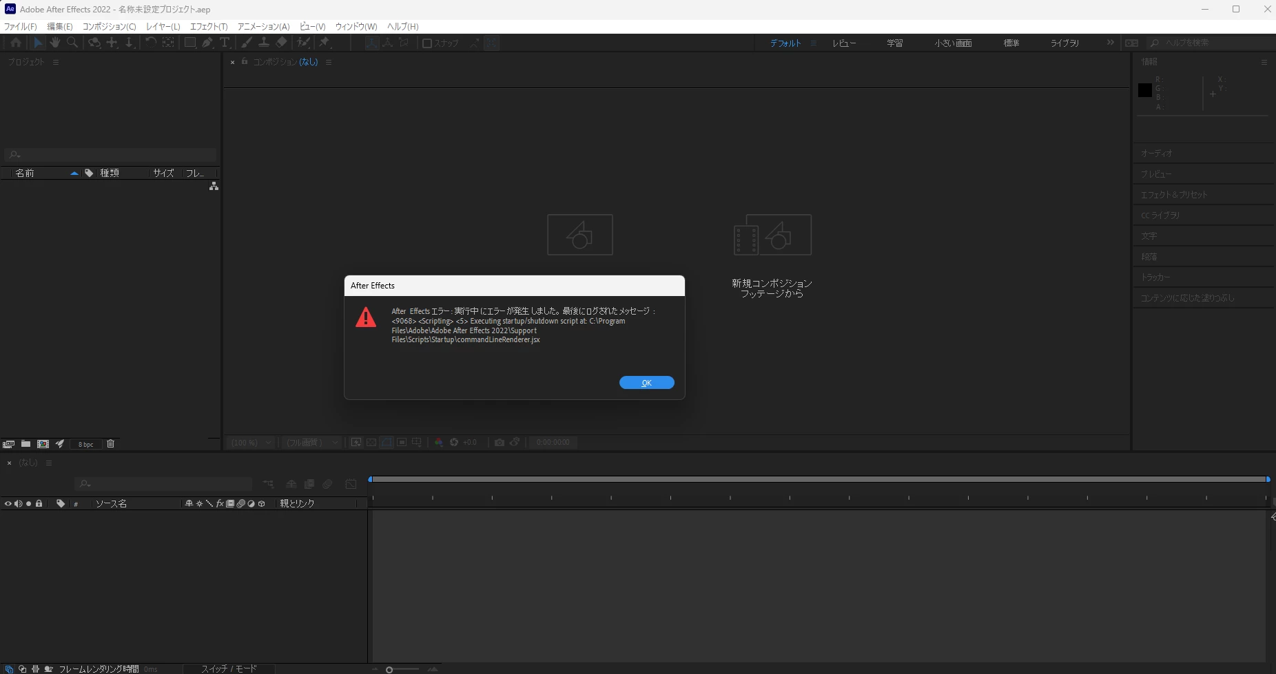 After Effects エラー : 実行中にエラーが発生しました。最後にログされたメッセージ :