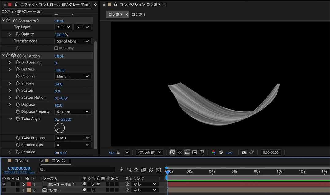 別の方法としては、2Dの画像にCC Ball Actionを使えば3Dに曲げることができます。