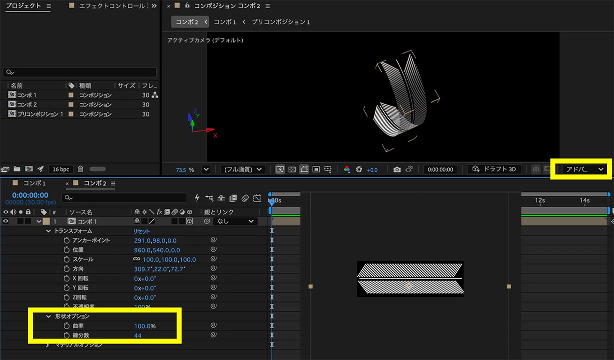 レイヤーを3Dにして、3Dレンダラーをアドバンス3Dにすると、