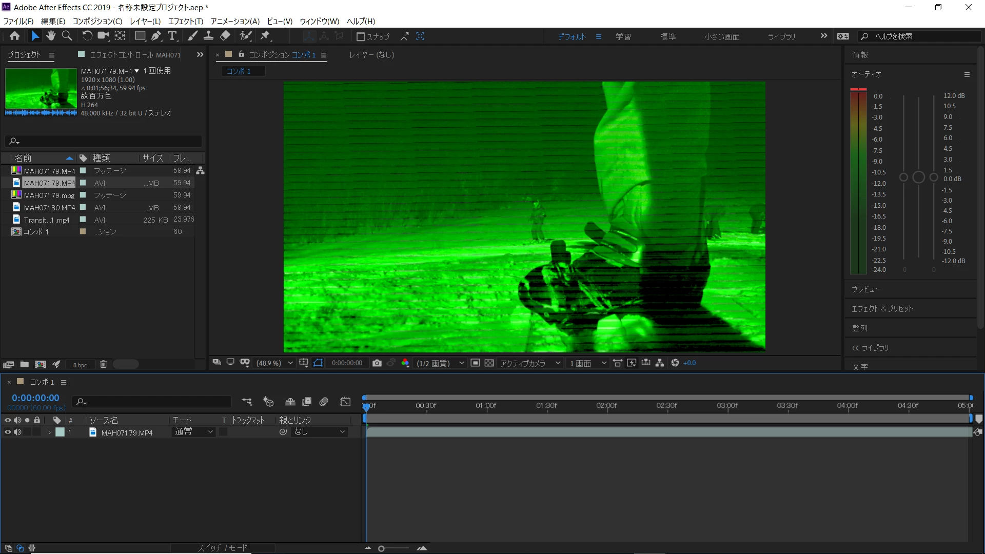 After Effectsに動画を読み込むと緑や紫の波模様や横しまが入ります。