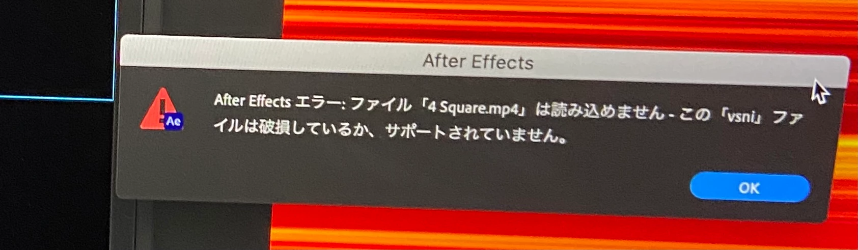 インストールしてからずっとですが、after effects2021でmp4を読み込むと"「vsni」ファイルは破損しているか、サポートされません""referencerror **は未定義です error on line 44"と表示され、何回やっても読み込めません。再インストールもしました。対処方法を教えて下さい。初心者なのでわかりやすく教えていただけると助かります。