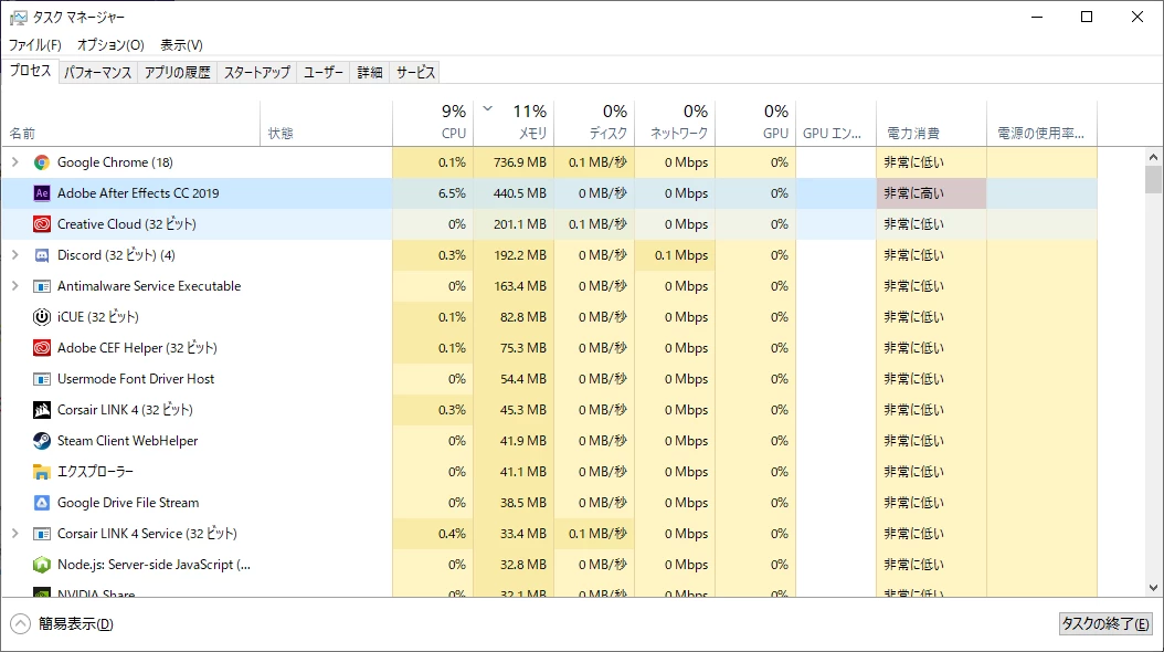 3,タスクマネージャーを開くとAftereffectsが対応なしで残っている。