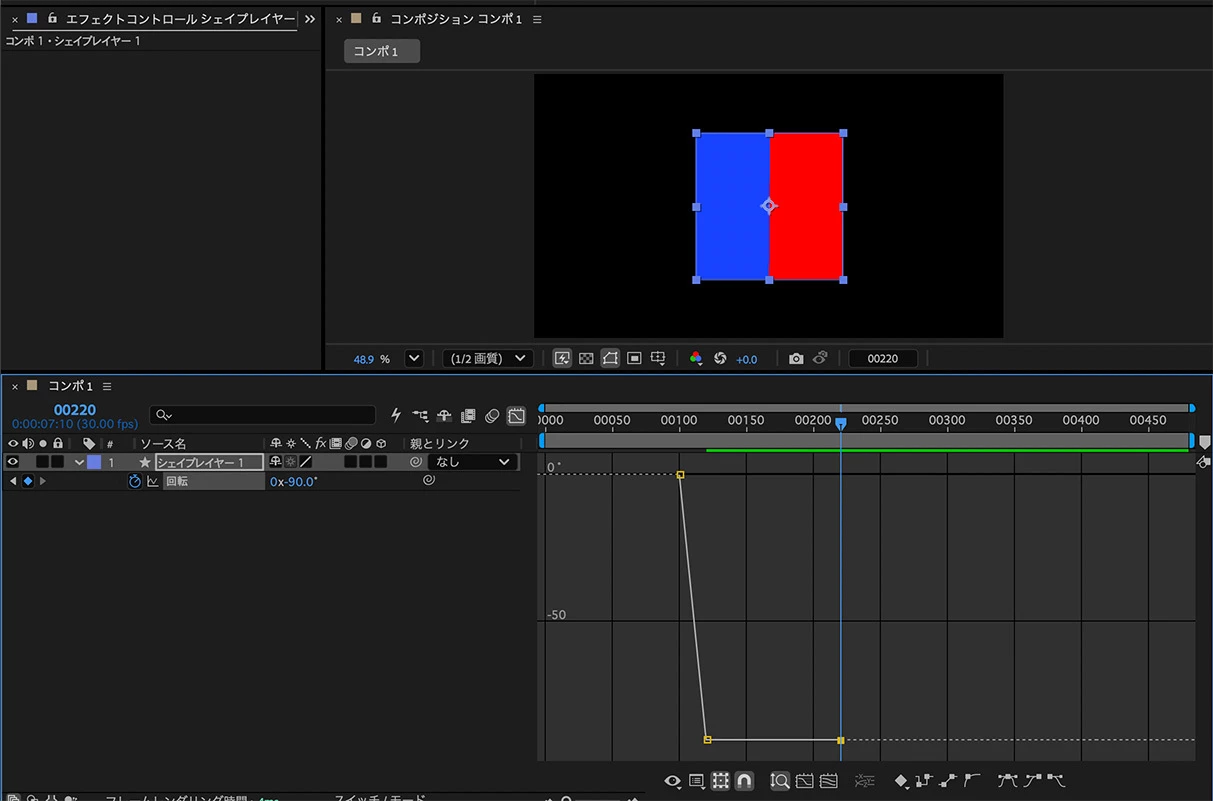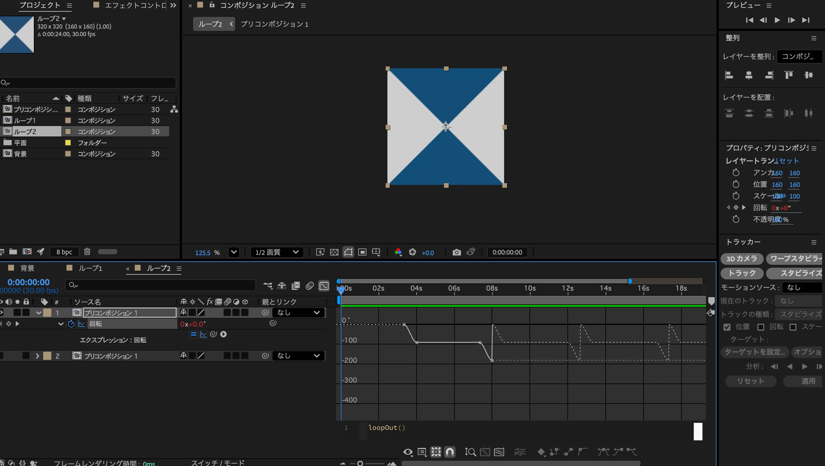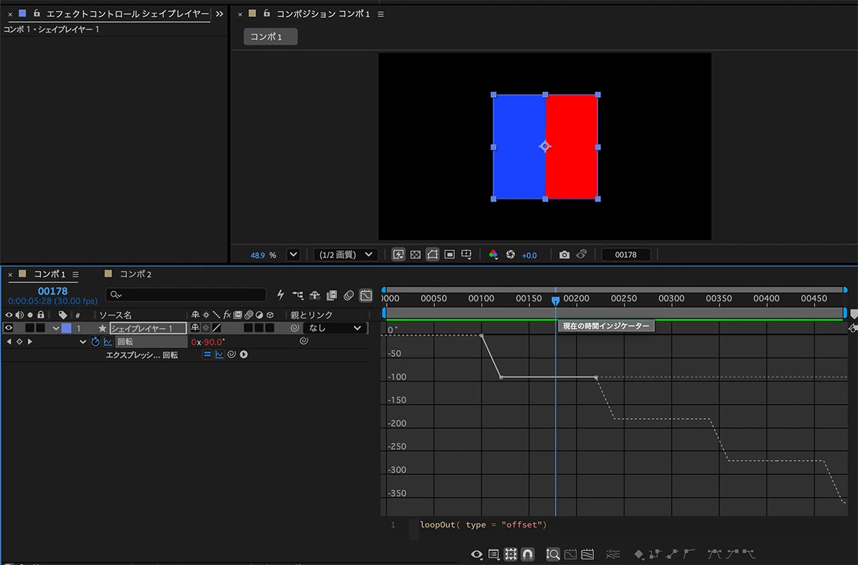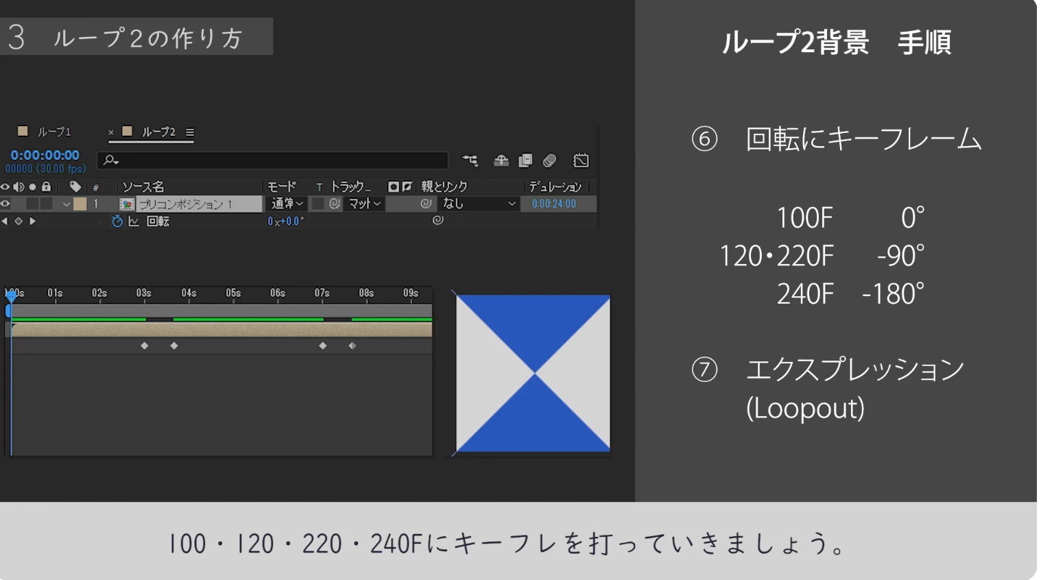 動画では一枚目の画像のように100F,120F,220F,240Fにそれぞれ0°,-90°,-90°,-180°の回転を打っており、そのキーフレームを全て選択した状態でエクスプレッションのloopoutをつけることで、一定間隔で反時計回りにくるっと回転する正方形を作成しているようです。