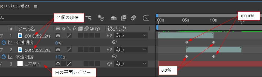 白の平面レイヤーは、クロスディゾルブがかかっている時に画面が暗くなるのを防ぎます。