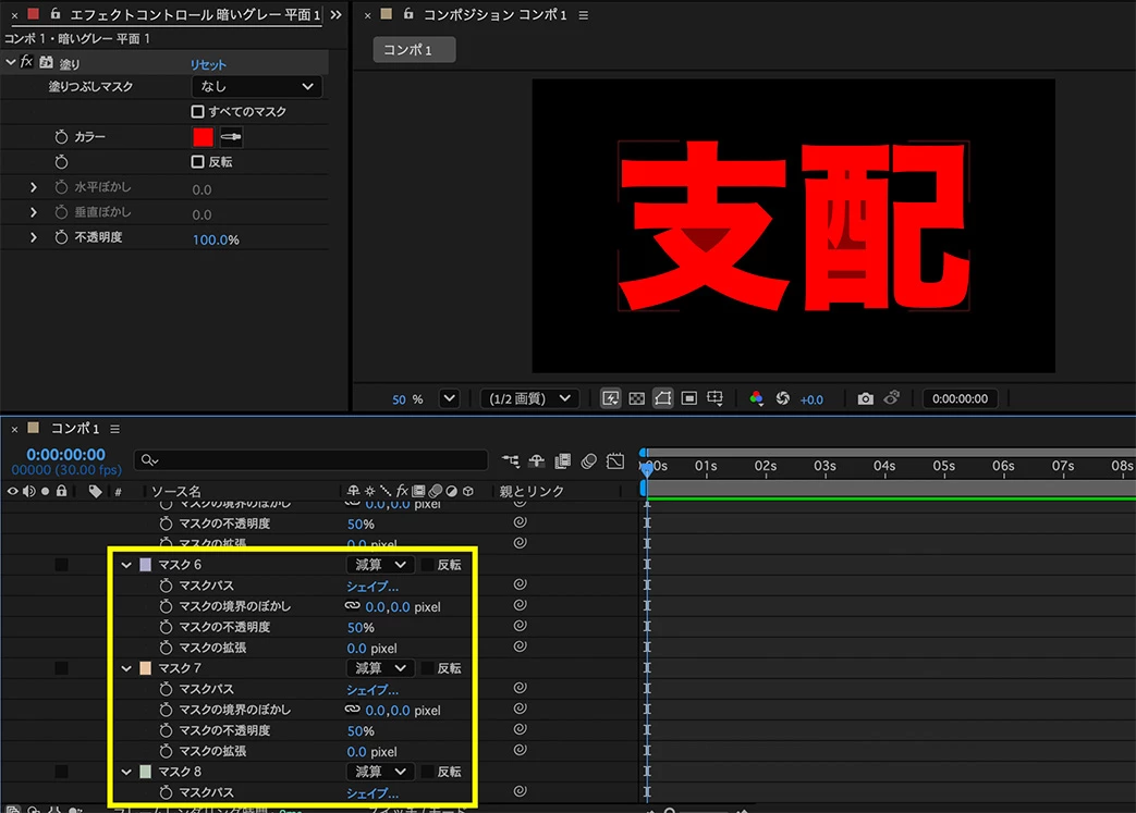 Illustratorでアウトライン化、複合パスの解除をしてからAfter Effectsの平面にコピペするとマスクが追加されます。