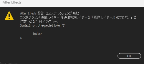 index*というエクスプレッションで画像に厚みを付けたいのですが、エクスプレッションエラーと出てきました。