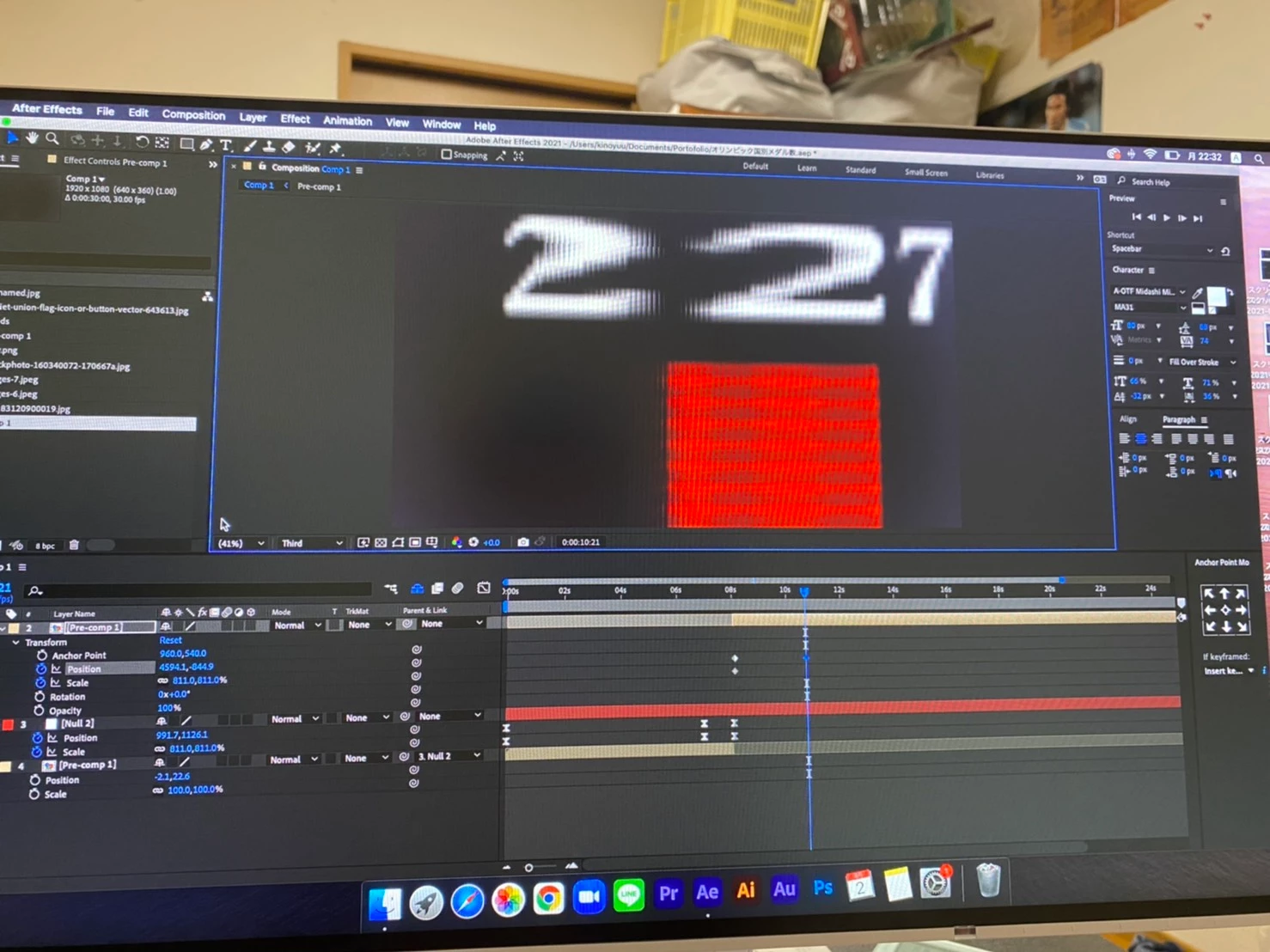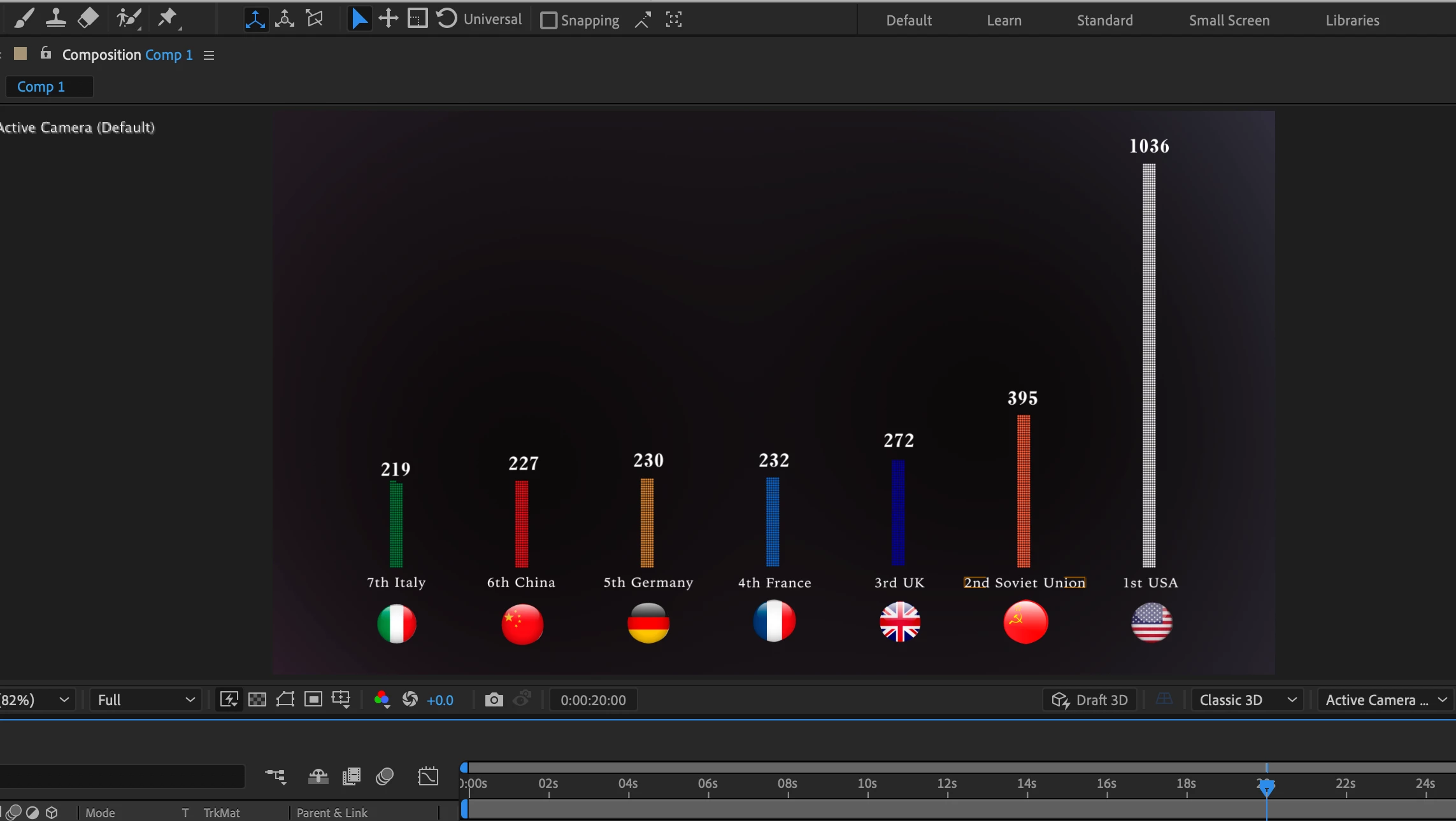 最初の画像が元のグラフィックで、棒グラフ(小さな円のリピーターで構成)が上に左側の国から順番に伸びて行くアニメーションを制作。そのアニメーションが起こっている際に、グラフ等にかなり近くまでのズームイン、そしてズームアウト、上下左右を舐め回すように移動させたいのですが。どうしても2枚目の画像のような空間や文字が歪んだ現象が起きてしまいます。初めは3dでカメラを使用。カメラのプロパティ、また、ヌルに紐付けたりしましたがどちらも歪みあり。次に2Dに戻しグラフ全てをプリコンポーズしてトランスフォームプロパティをいじっても歪みあり。特に深くズームインした後に右へ移動しながらズームアウトする動きに歪みが生じます。キーフレームを打たなければ大丈夫ですが、打つと歪みます。その他色々と試しましたがうまくいきません。そこまでPCに負荷のかかる作業でもないのでスペック上問題もないと思われます。