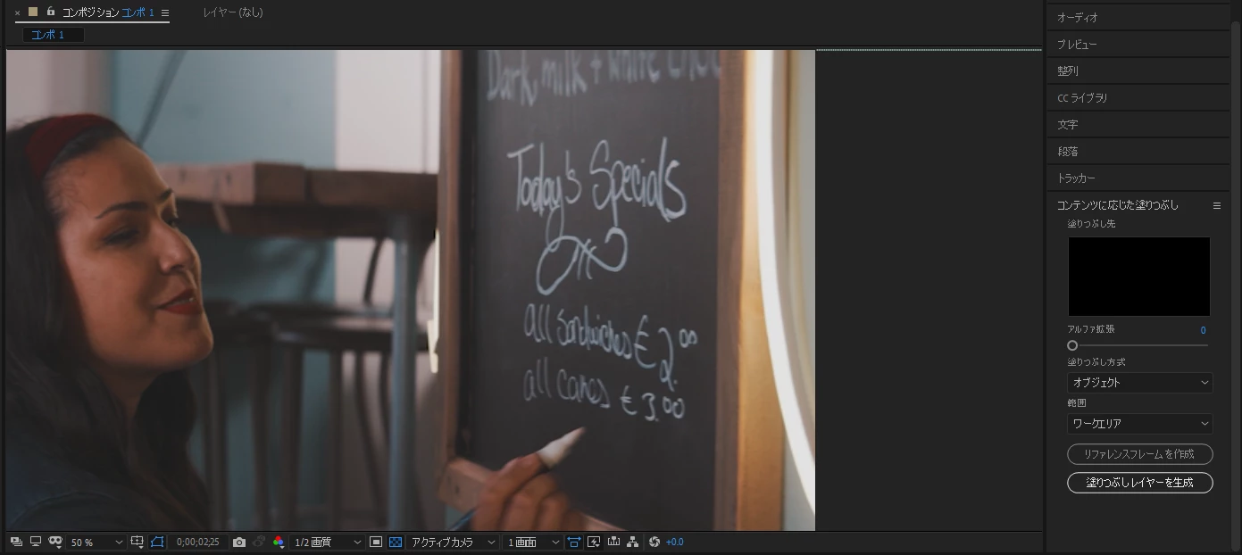 添付した画像にもあるように、塗りつぶした範囲に椅子の脚がうつってしまいます。マスクの範囲を”Todays Specials”の部分に絞って実行してみたのですが、この場合は下の”all ~"の部分がうつってしまい綺麗に塗りつぶしができませんでした。