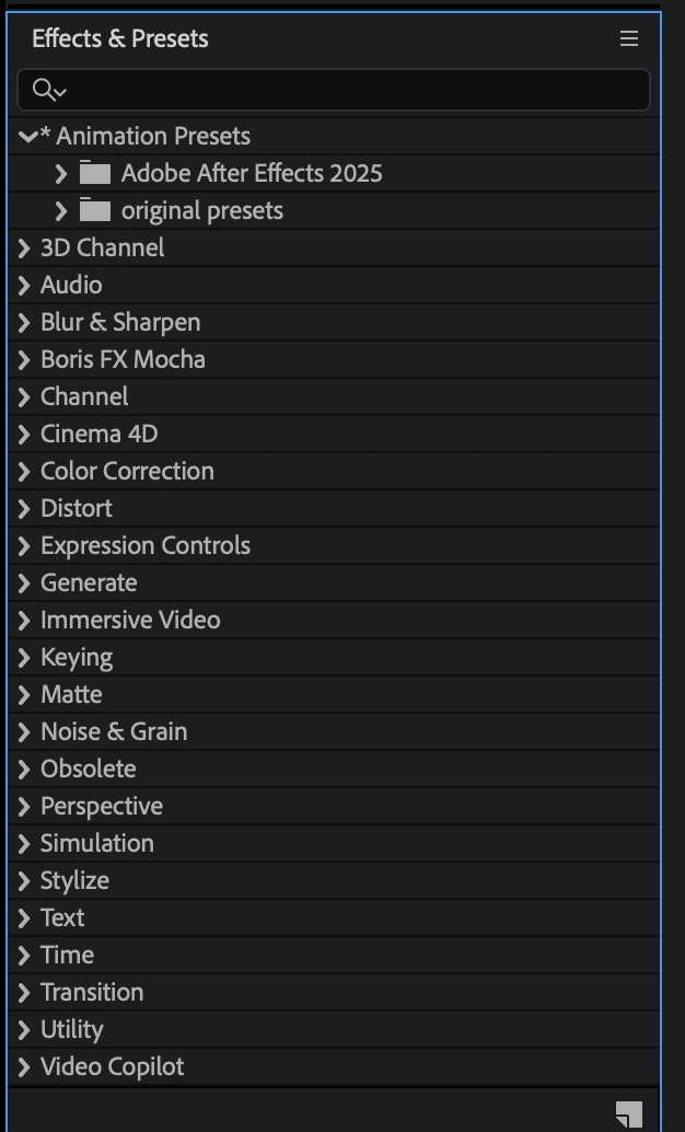 添付した画像のプリセッツファイルがAEの画面右側にあるEffects&Presetsの欄に出てきません。