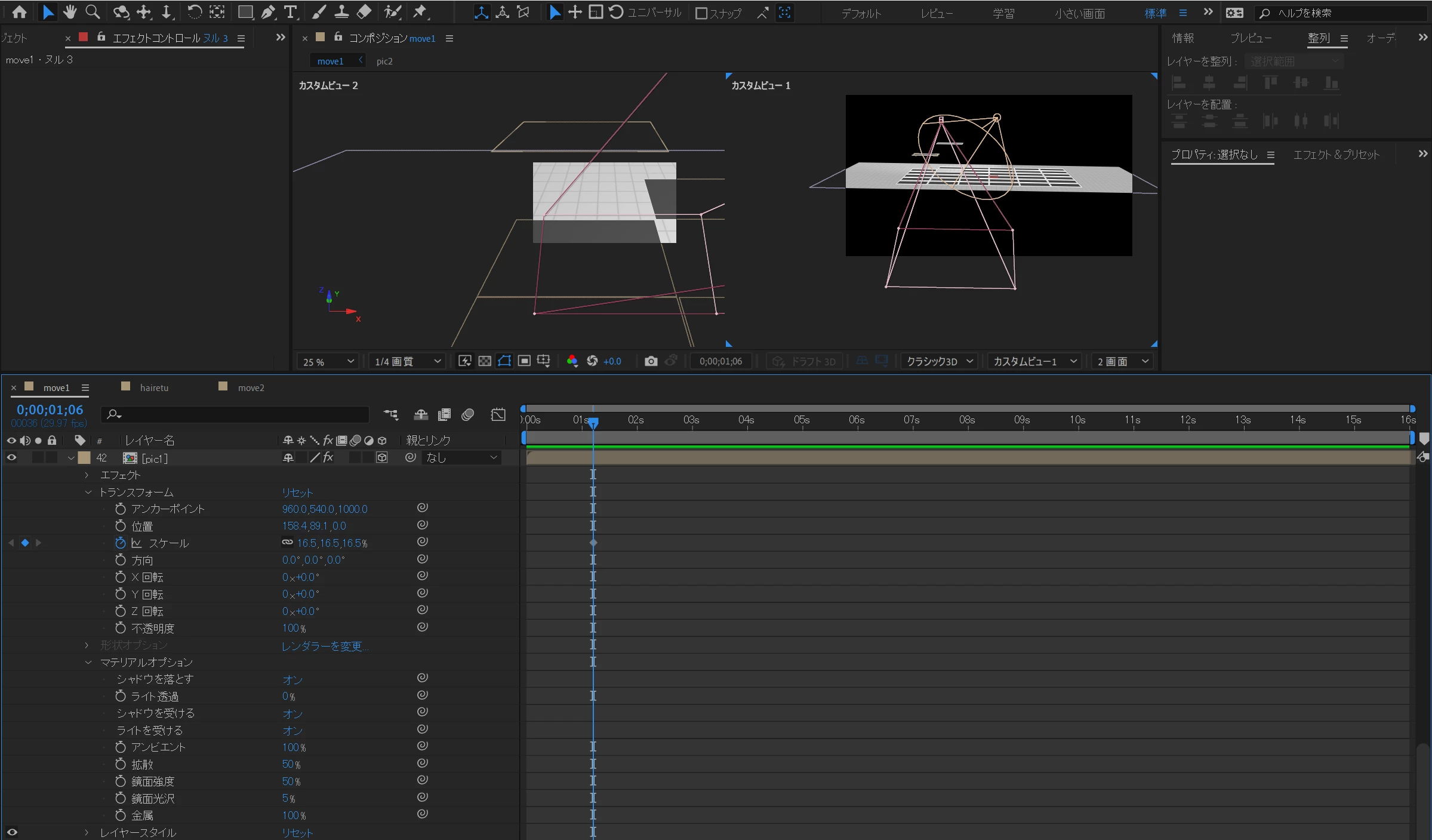 写真が上から落ちてくる表現を作りたくて、youtubeの動画等を参考に作っているのですが指示通りに作業をしても写真からシャドウが落ちてくれません。