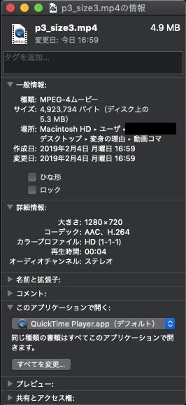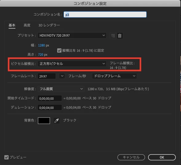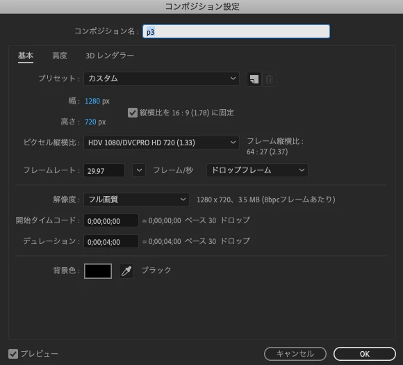 コンポジションのファイルサイズを1280x720に設定して動画制作をしました。