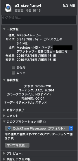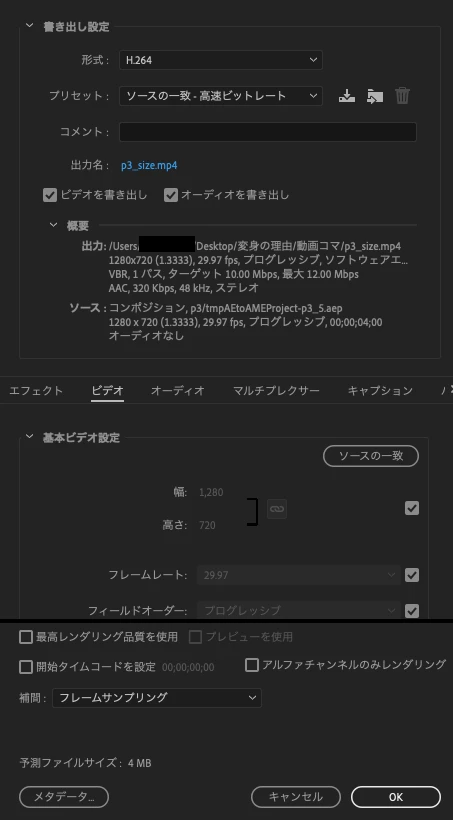 その場合、拡張子は.mp4(H.264)が選択肢にないので .mov(Quicktime)でレンダリングしています。