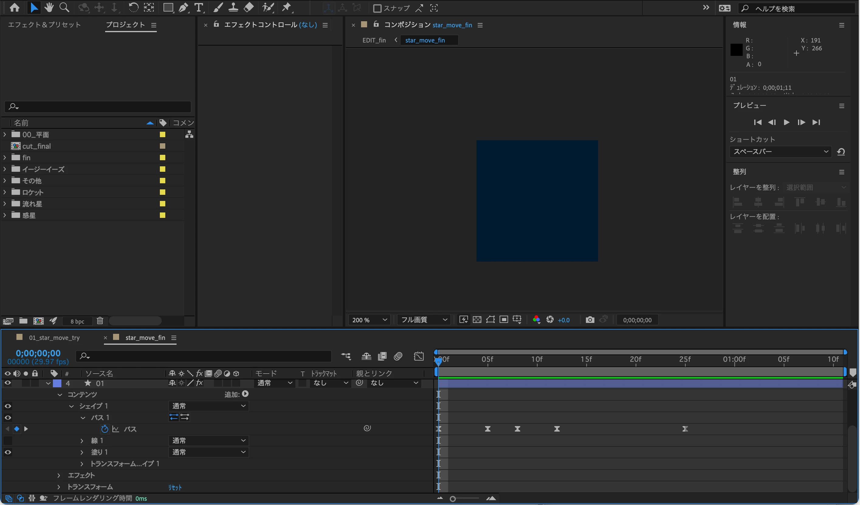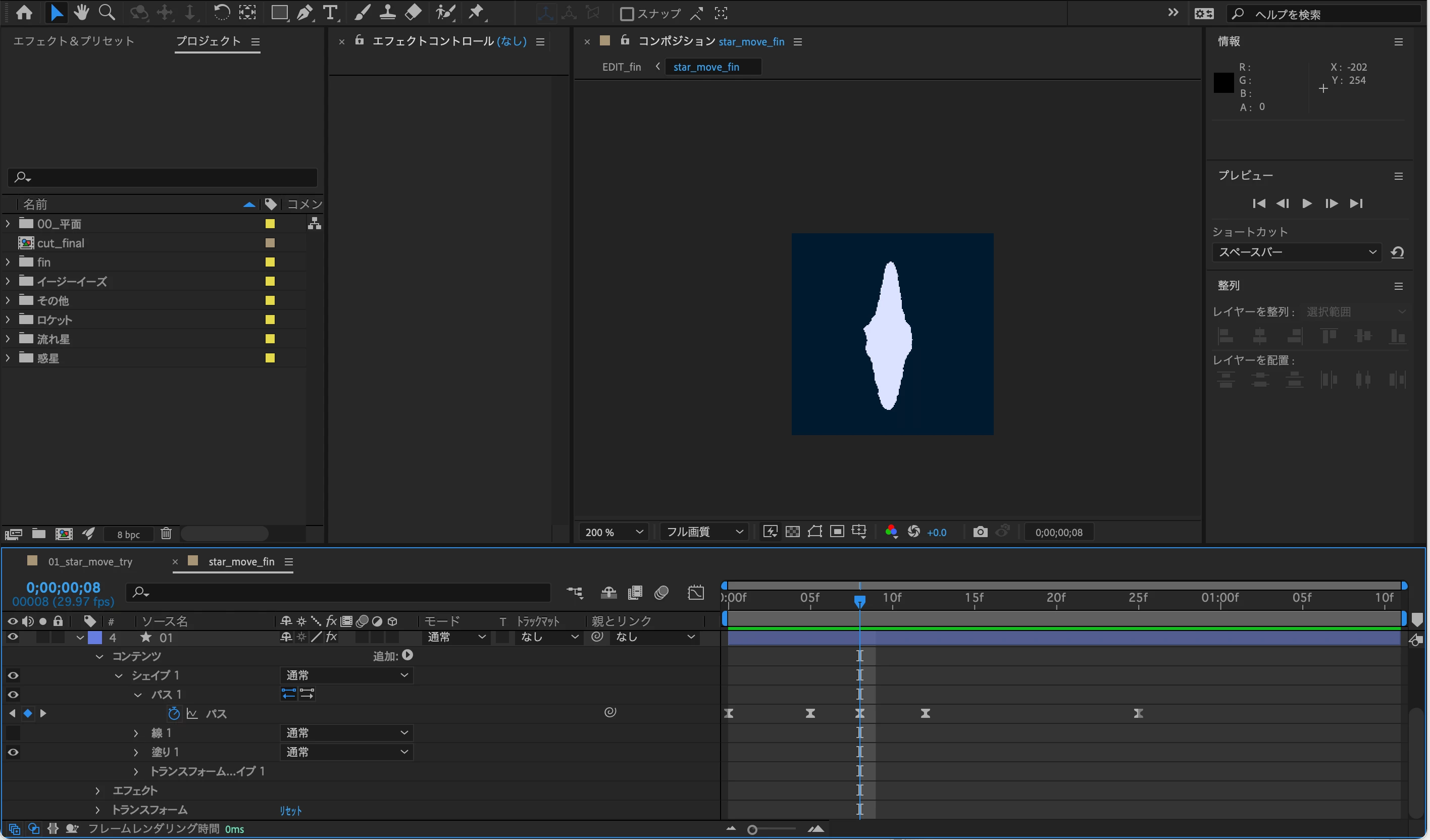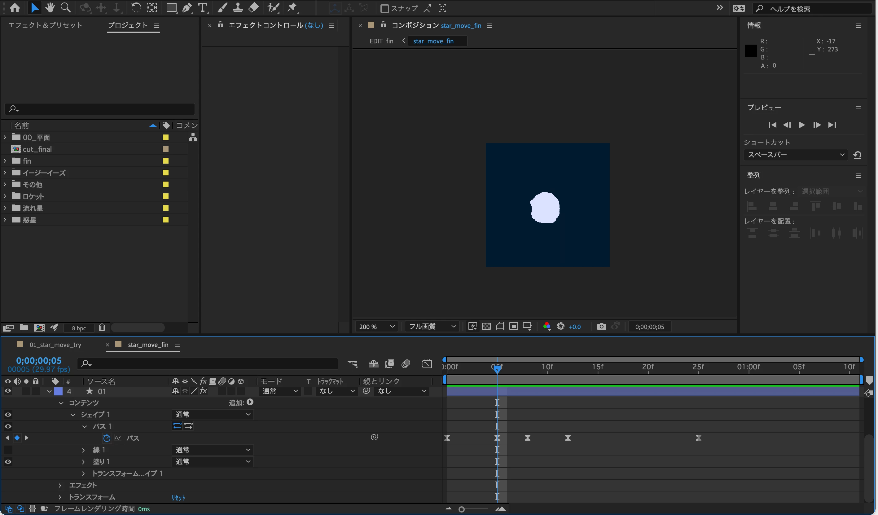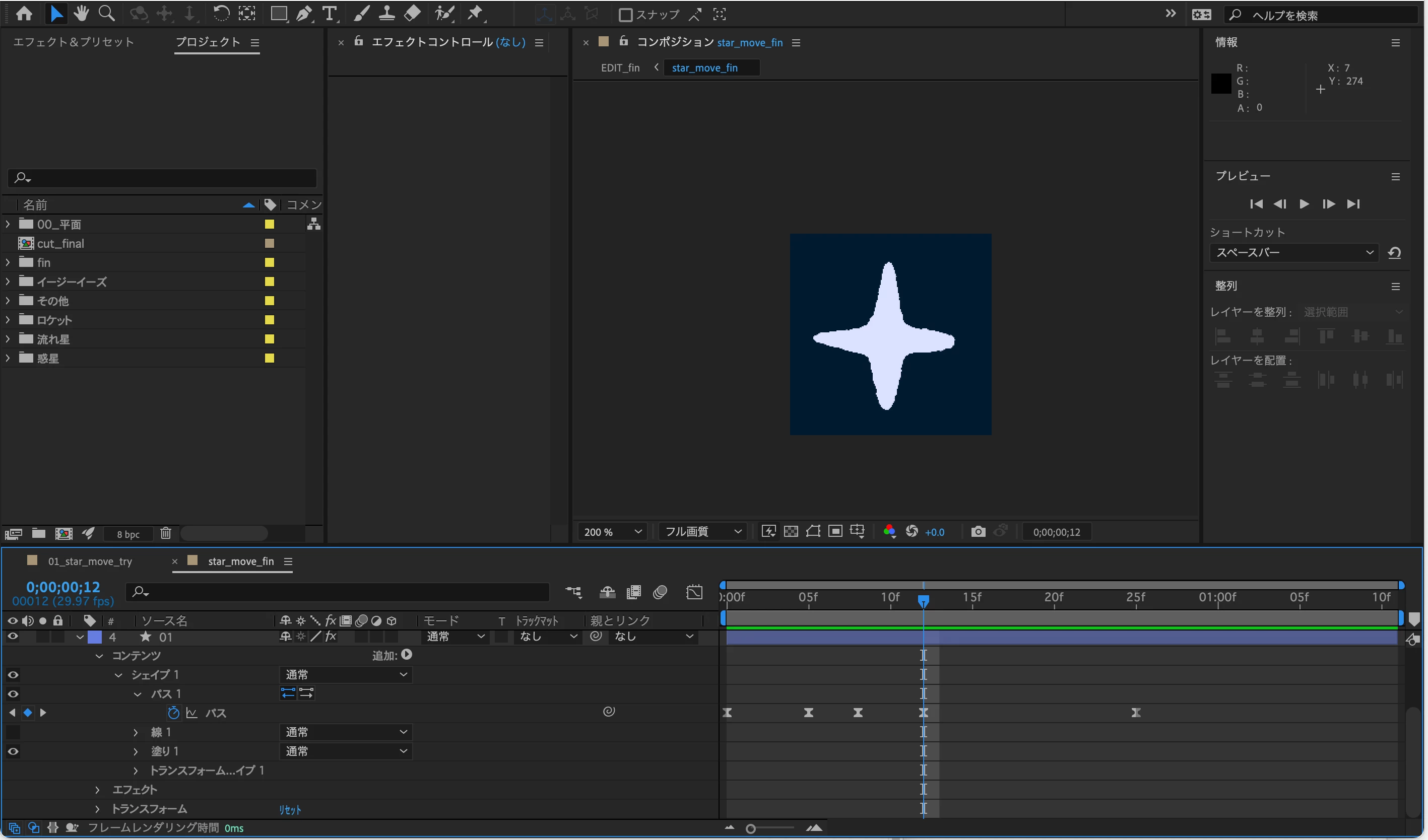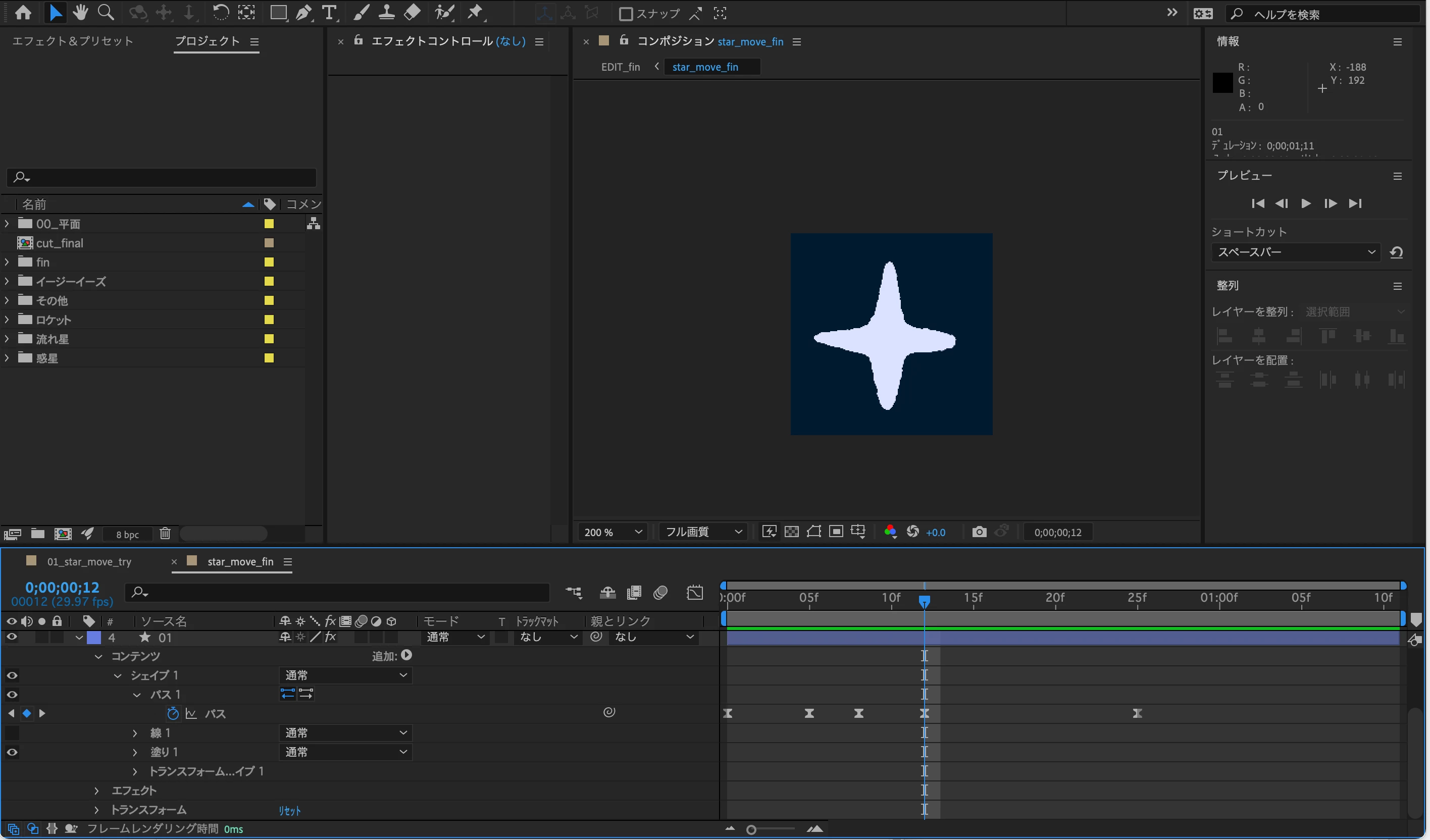 チュートリアルとしてダウンロードした作成用のaepには、使用する星のシェイプが既に配置されている状態でした。