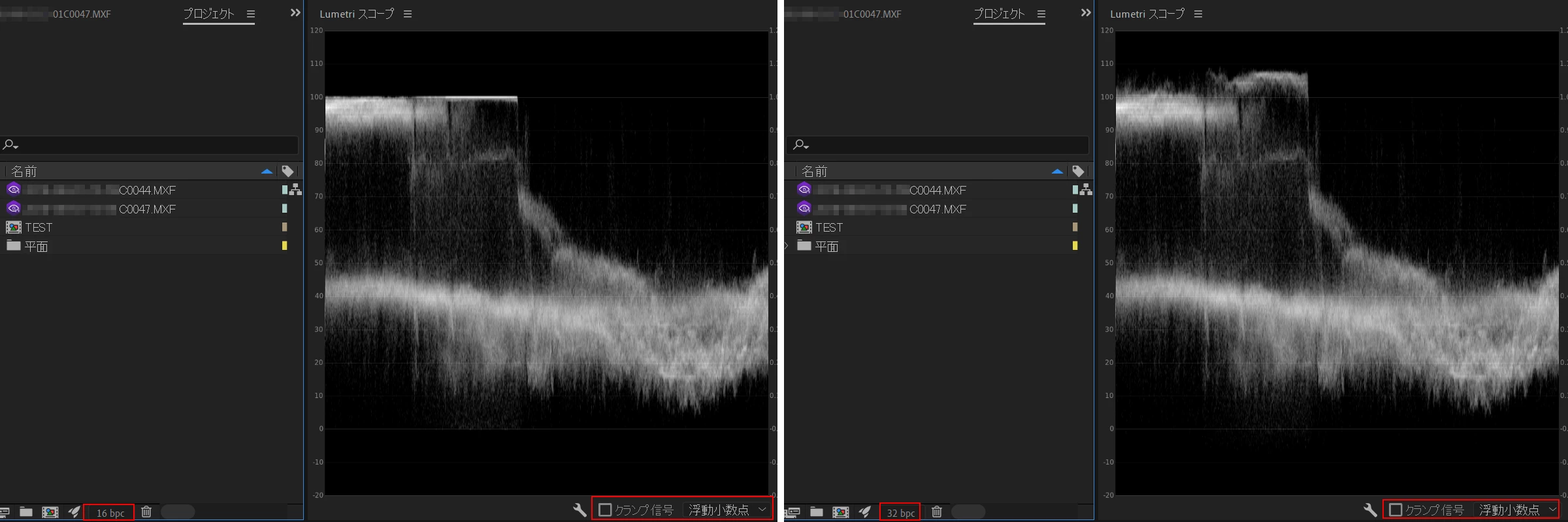 添付しました画像のように、32bit浮動小数点にすると100%以上の信号が見られる場合は、若干白飛び部分の諧調が戻ってくるかもしれません。
