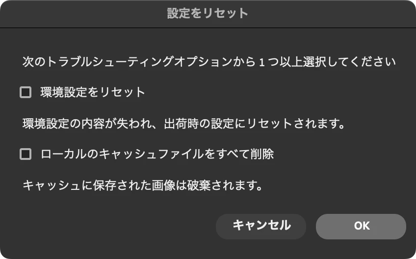 このダイヤログを表示して「環境設定をリセット」にチェックをつける方法でしょうか。