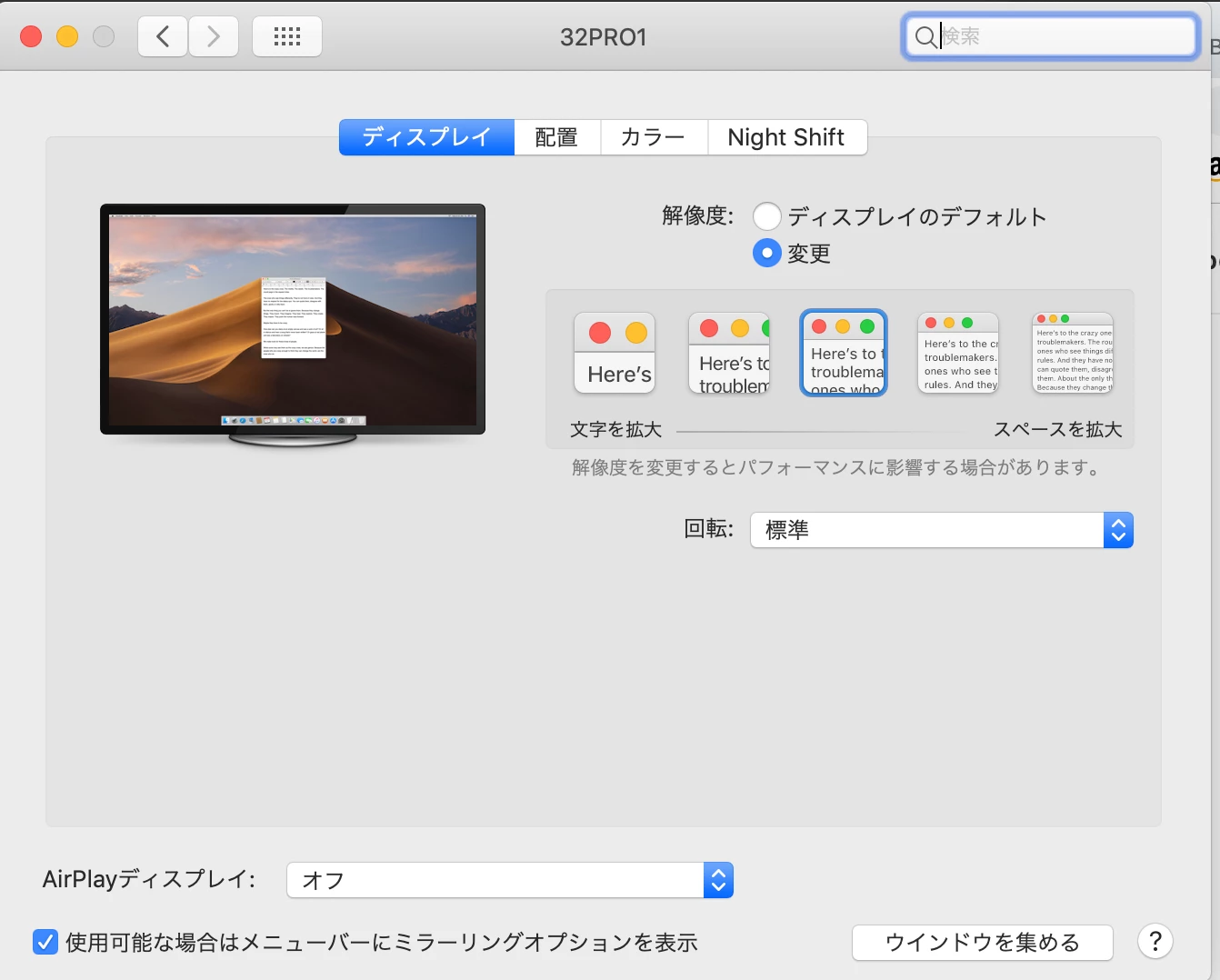 現在4Kモニタ(TOSHIBA 32PRO1)を使用していますが、表示が細かすぎるので解像度変更で真ん中の3008×1692にして利用しています。