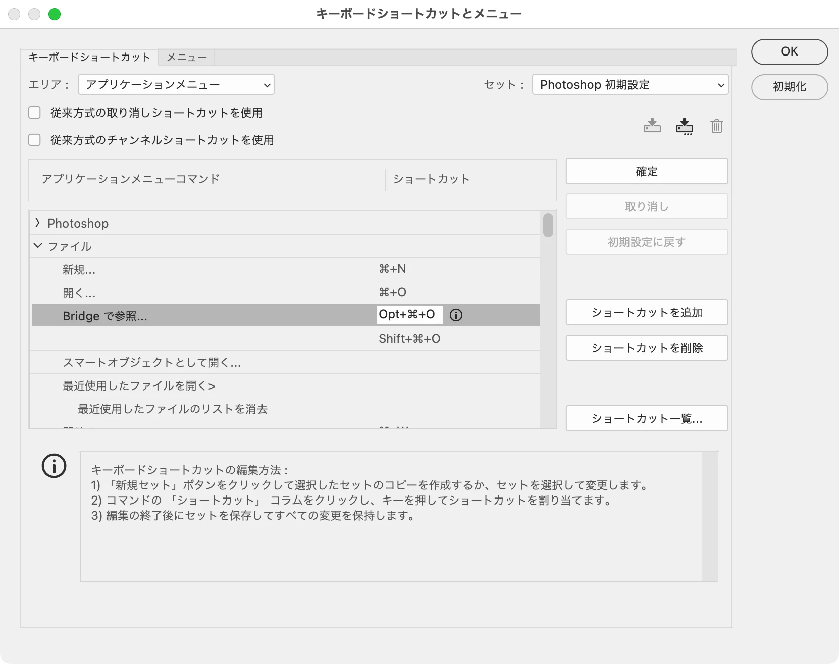 「編集」メニュー→「キーボードショートカット」でBridgeを起動するショートカットを削除します。