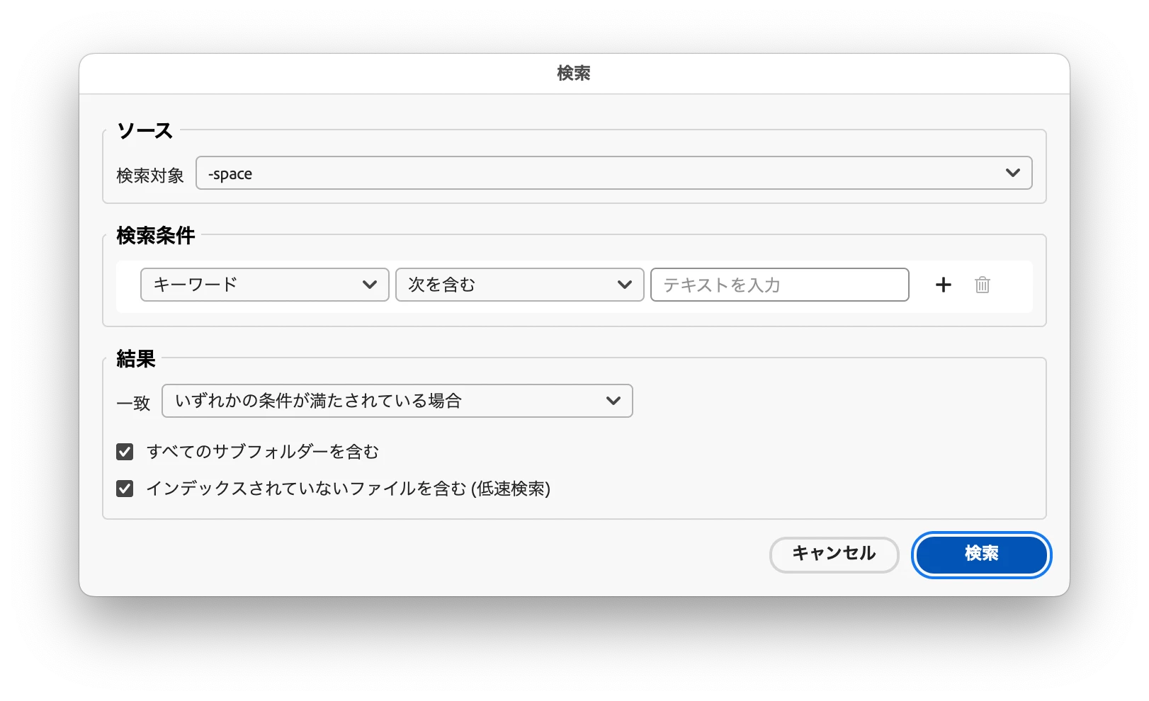 ダイアログが表示されたら「検索条件」の項目をプルダウンして「キーワード」に変更します。