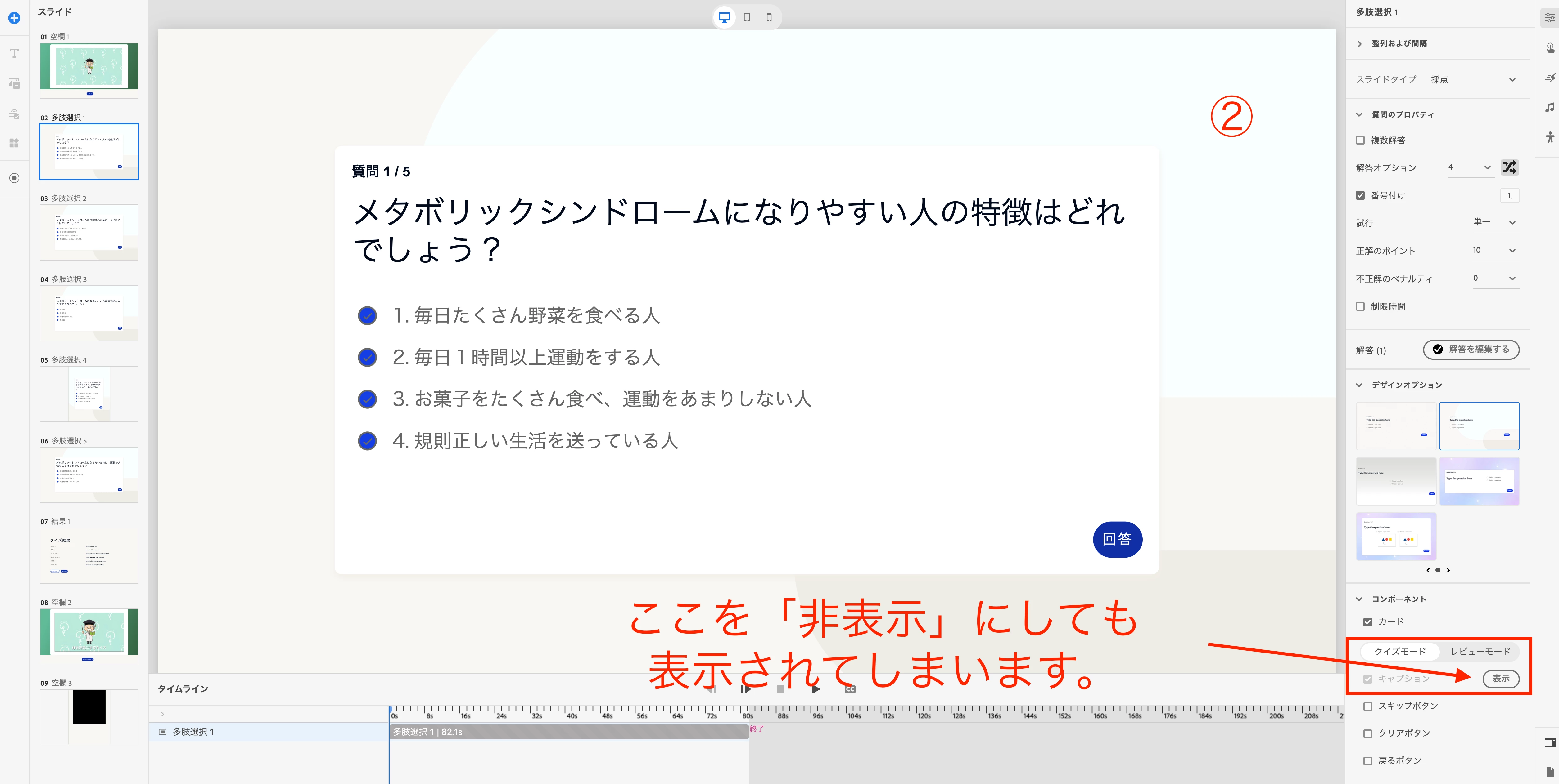 インタラクティブ動画を制作しているのですが、受講者がクイズに答えた後の「キャプションの表示について」ご質問いたします。