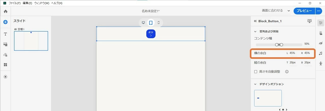 「インタラクティブコンポネートを追加」から「ボタン」をクリックし、スライドにボタンが追加されたのですが、追加されたボタンの位置が「デスクトップ」、「タブレット」、「モバイル」のそれぞれのデバイスで中央配置したいです。仮にデスクトップの方で中央に配置(添付画像の①)しても、タブレットとデバイスに切り替えてみると、中央に配置されません(添付画像②、③のようになります)。どのデバイスでも中央に配置したいのですが、やり方について詳しい方ご教示していただけると幸いです。よろしくお願いいたします。