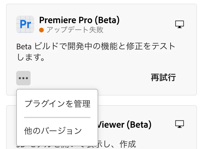 したいのですが、Creative Cloudの画面からPremierePro(Beta)の「・・・」を選択しても「アンイストール」が表示されません。