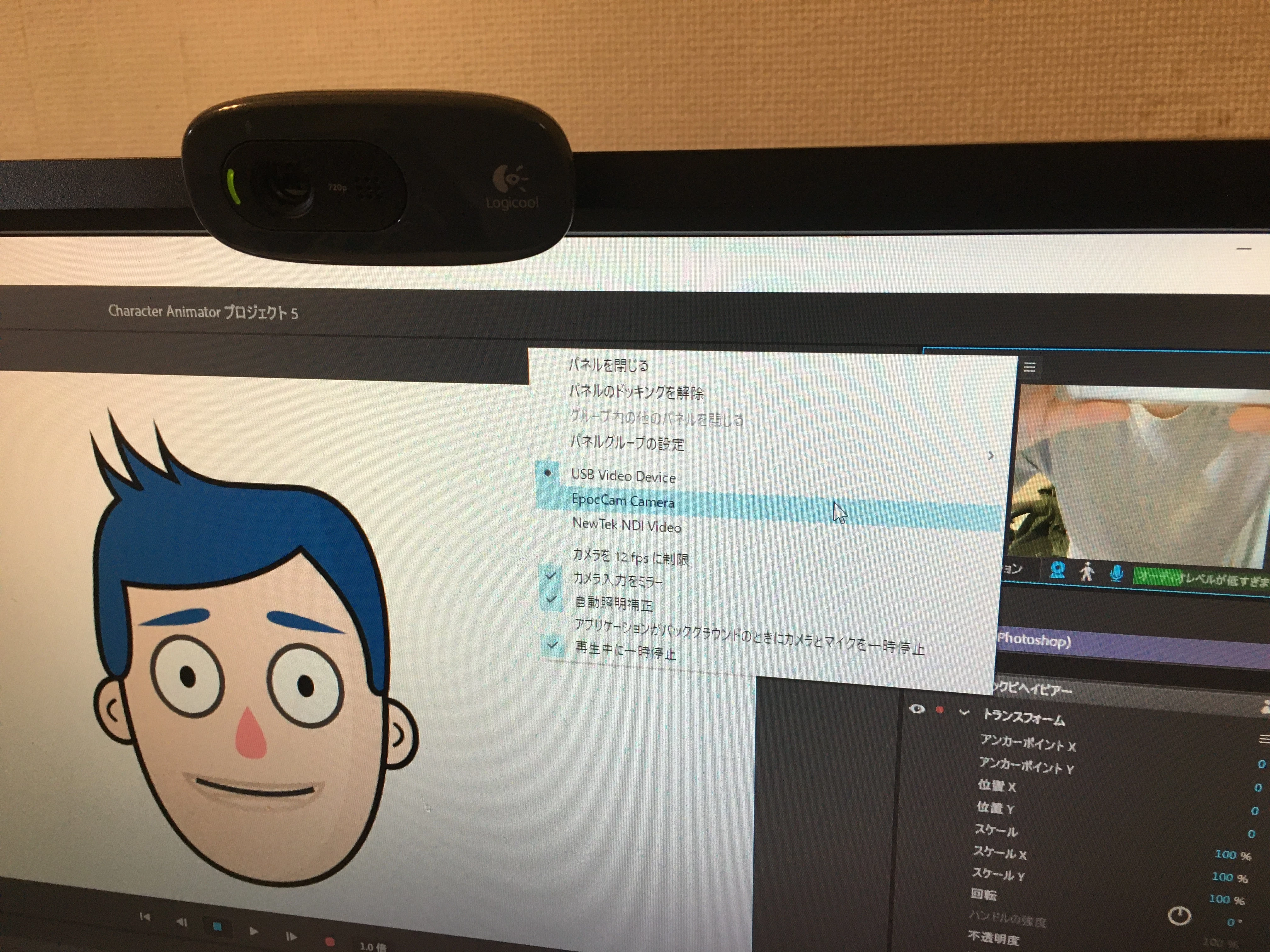 また、adobe Ch起動後はロジクールカメラ設定ソフトからも映像が表示出来なくなります。PC再起動する事で復帰します。