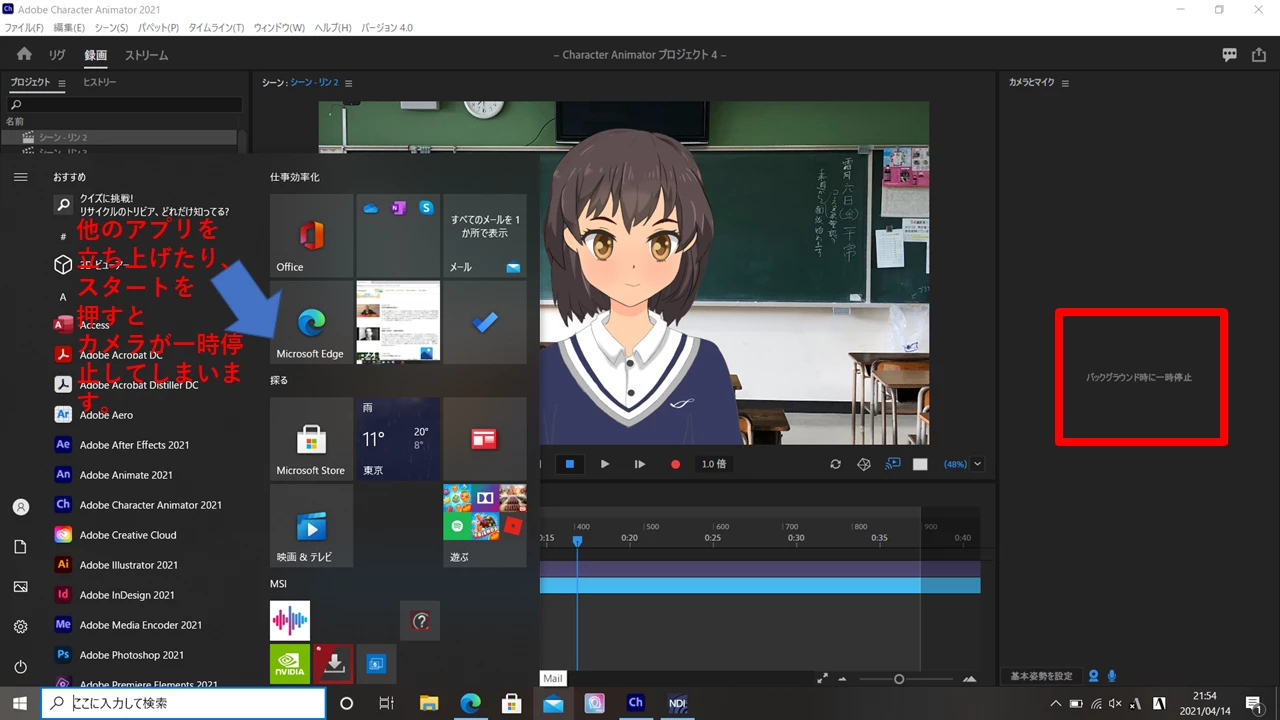 「スタート」ボタンを押したり他のアプリやフォルダを開くと、バックグラウンドでカメラが停止してしまいます(写真はスタートボタンを押すと、赤枠にあるカメラが停止する様子)。