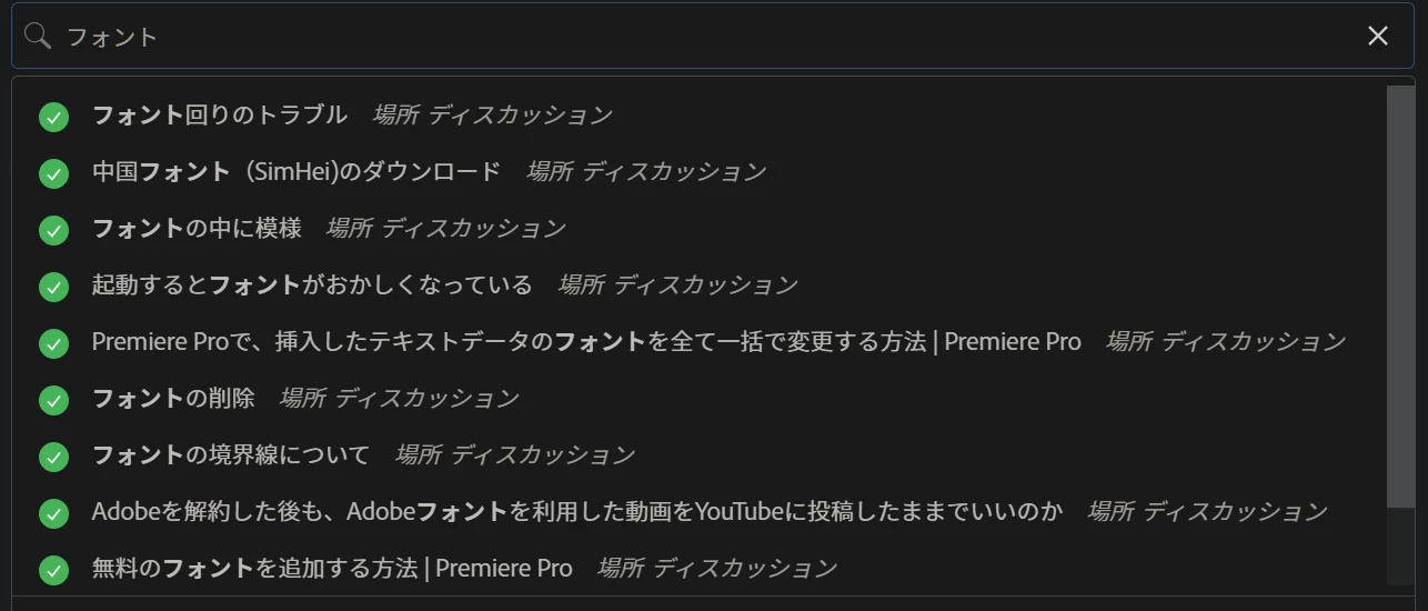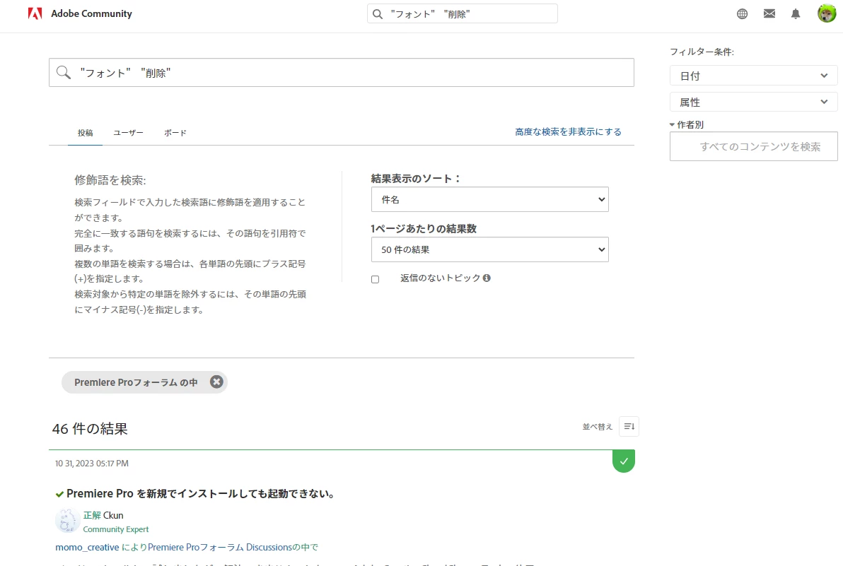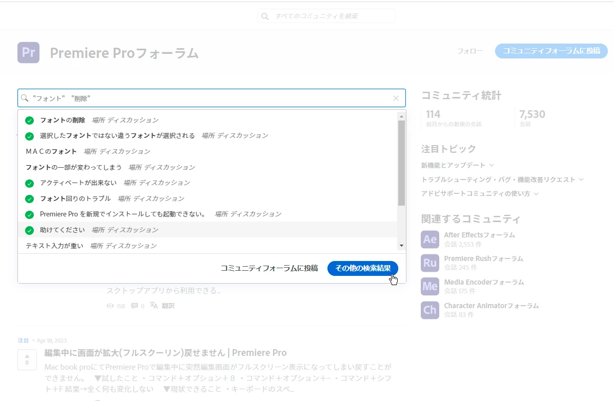 例えば、PremiereProのフォーラムで「フォントの削除」について調べようとしても、0件です。