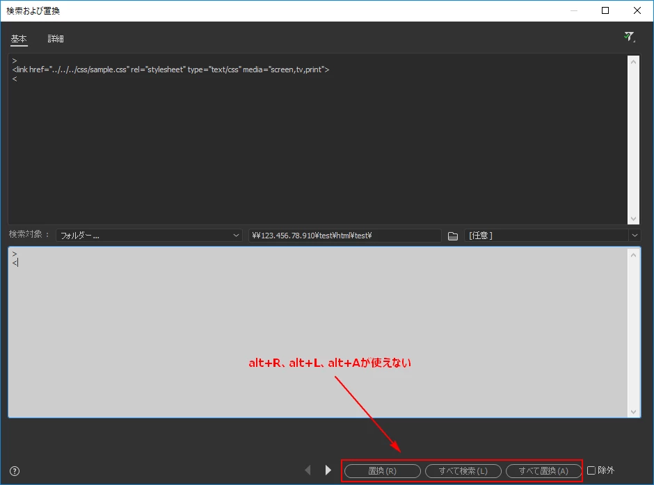 DreamweaverCC2018のファイルを横断して検索/置換で右下にある [置換(R)] [すべて検索(L)] [すべて置換(A)] がマウスを使っては実行できますが、[alt+A]などのキーボードショートカットが使えません。