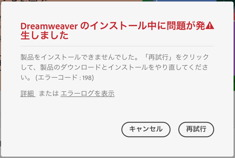 Dreamweaverがエラーコード198でインストールできません