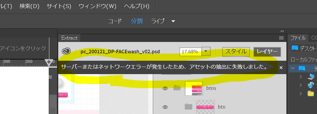 "サーバーまたはネットワークエラーが発生したため、アセットの抽出に失敗しました。"
