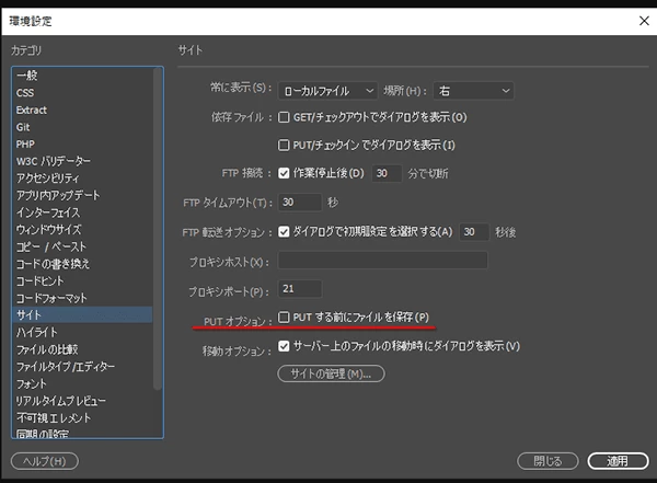 ダイアログの表示については、環境設定>サイト>PUTオプションの「PUTする前にファイルを保存」を確認し、チェックが外れている場合は、チェックを入れて「適用」を押してみてください。