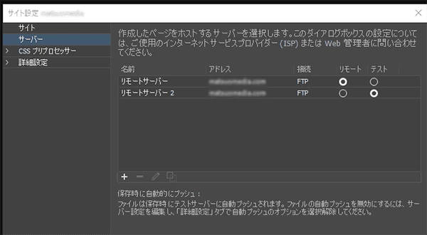 サーバーに関してはリモートサイトを設定せずテストサーバーのみ設定しています。