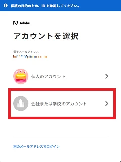 2. アカウント選択画面で「会社または学校のアカウント」を選択