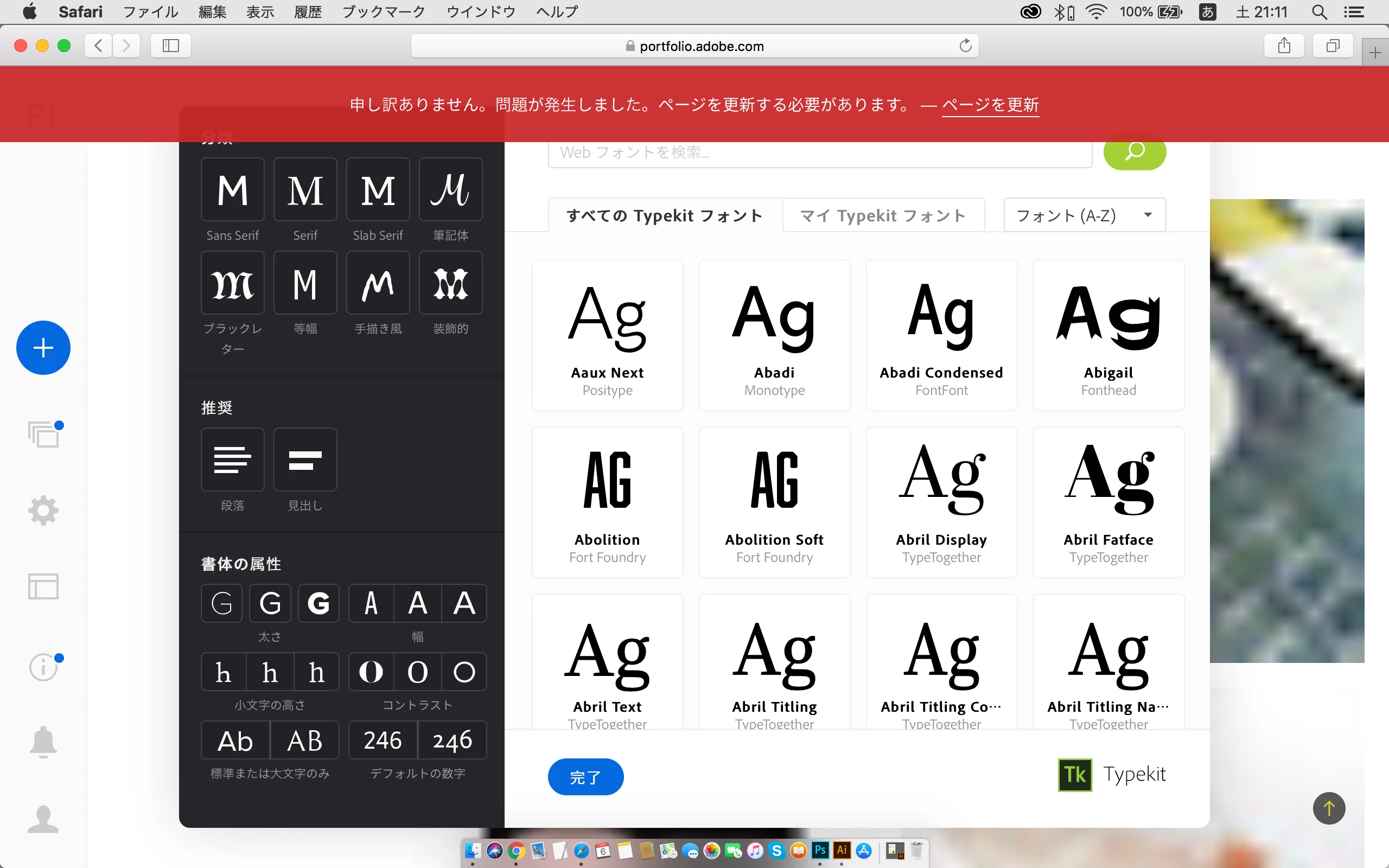 Adobe Portfolio でタイプキット でフォントを指定しようとすると、エラーが出てフォントが指定できない。