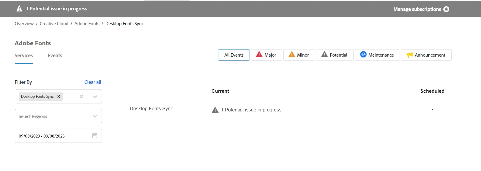 現在(2023年9月8日13:33)Adobe Fontsのサーバーにて、“Desktop Fonts Sync(デスクトップとのフォント同期)”「1 Potential issue in progress(1 進行中の潜在的問題)」というエラーが発生しているようです。