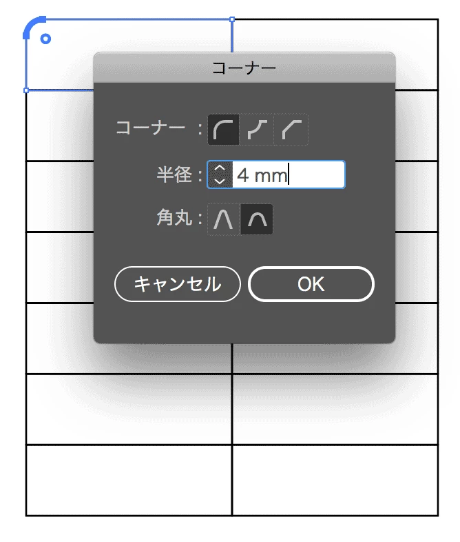 ダイレクト選択ツール(白い矢印のツール)で角丸にしたいコーナーを選択すると、コーナーウィジェットが表示されますので、そこをドラッグするか、ダブルクリックすると数値で角丸が設定できます。