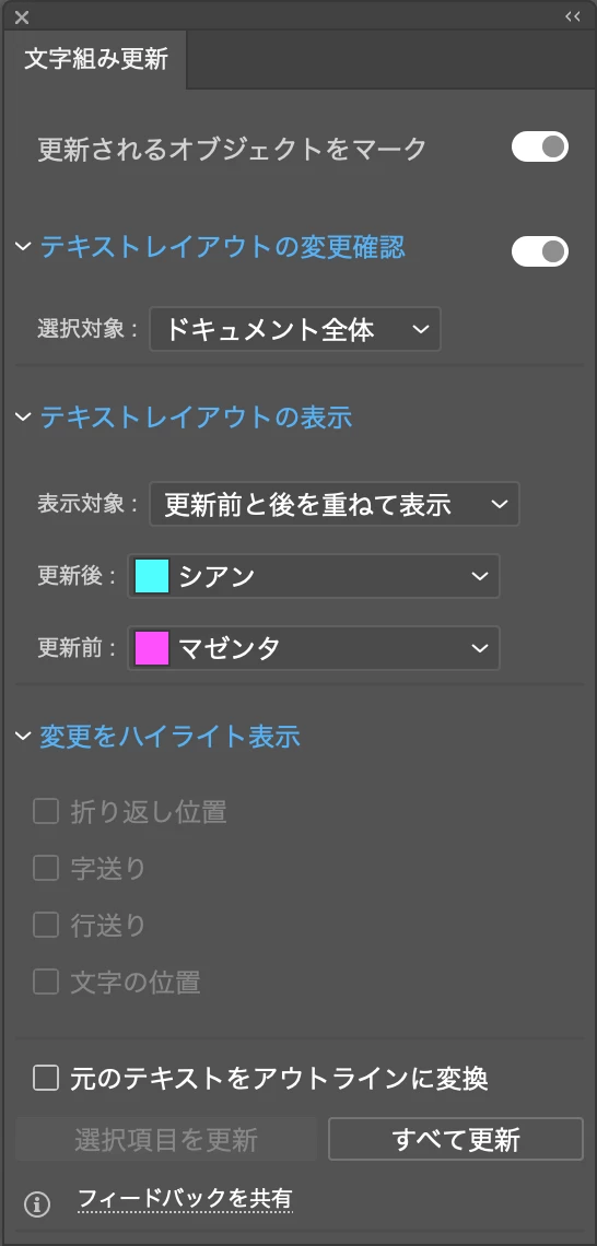 Illustratorで作成したデータを、再度開くと「文字組み更新」のパネルが出てきて、