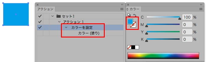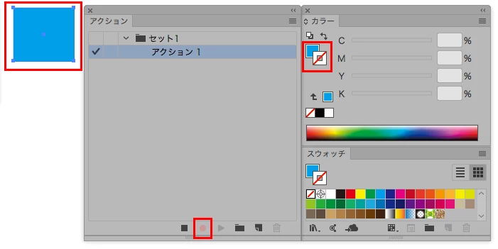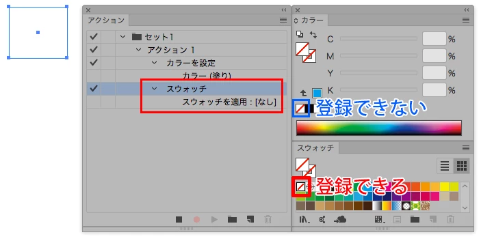 実は、最近のイラストレーターでアクションに「塗りなし」を登録したい場合は、カラーパネルの「なし」ではなく、スウォッチの「なし」を指定することで可能です。