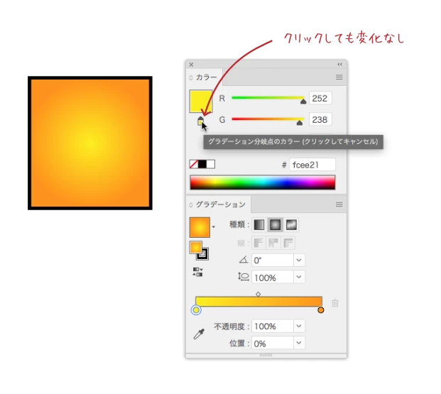 グラデーションの分岐カラーを選択するとカラーパネルでクリックで解除できないの、私だけでしょうか。