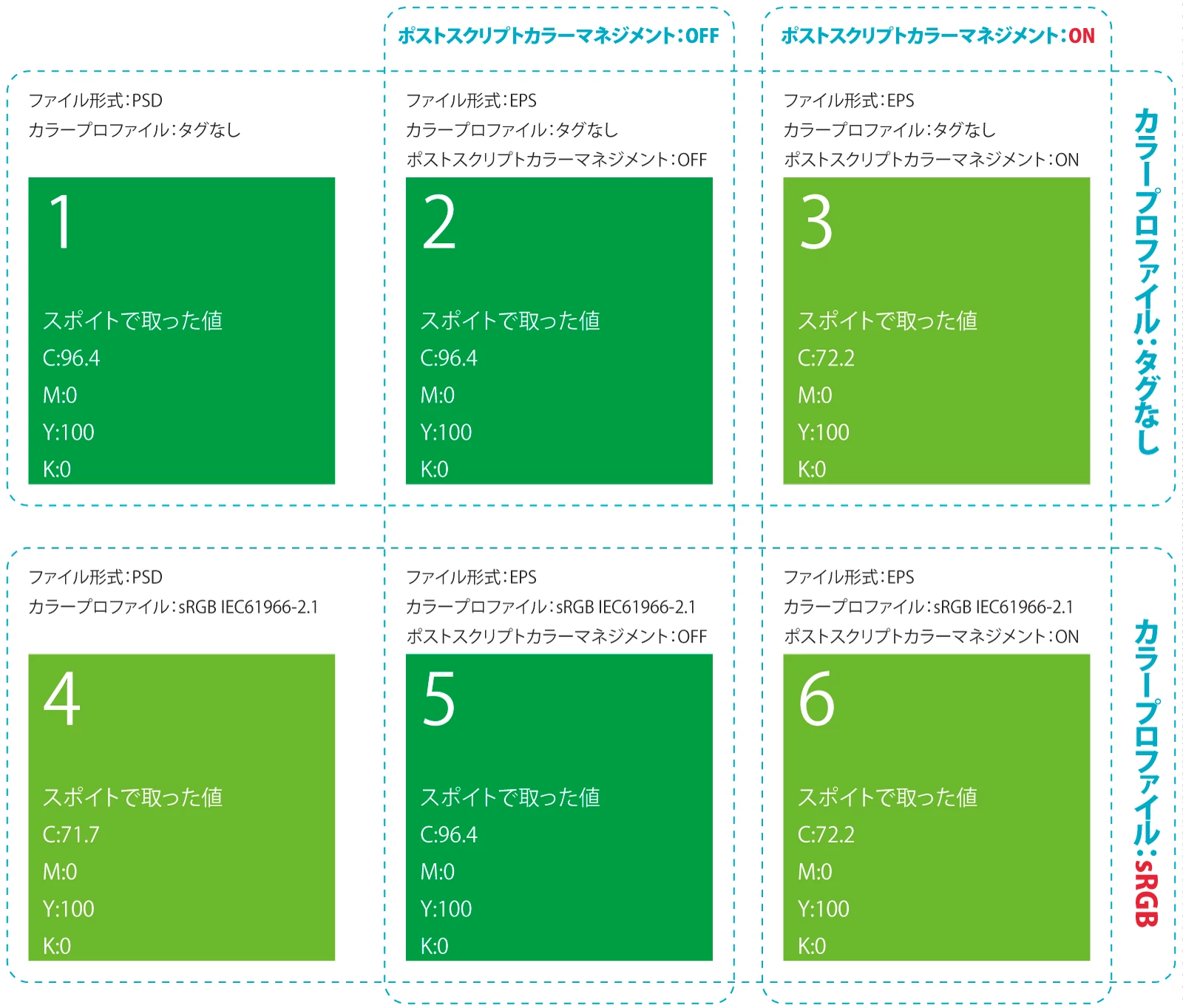 ポストスクリプトカラーマネジメントON・OFFの組み合わせの