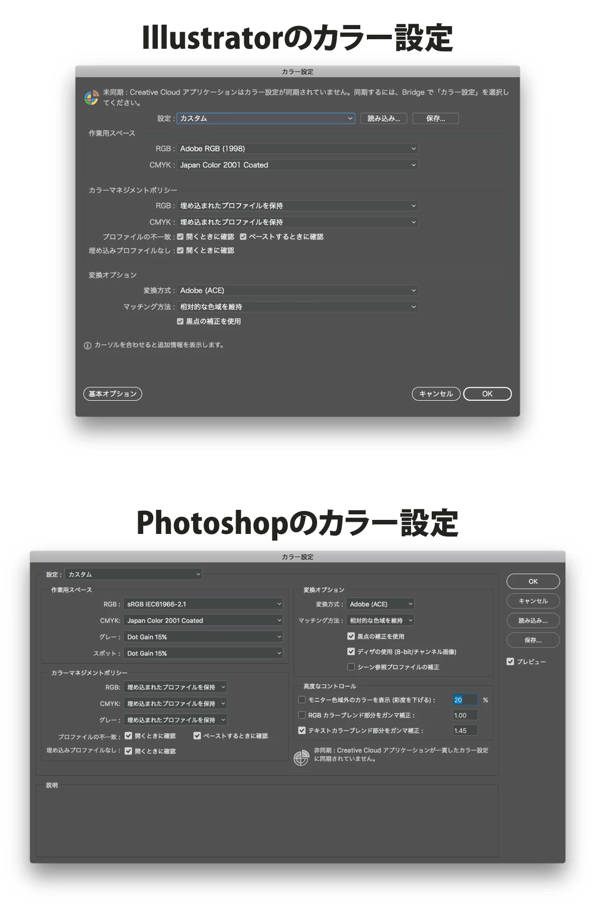 カラー設定やカラーモードをそろえれば問題は起きづらそうですが、すっきりしません。