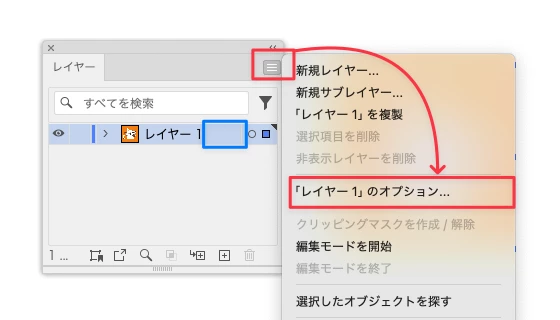②青枠のあたりをダブルクリックするか、レイヤーパネルメニューから「レイヤーオプション」を開いて……